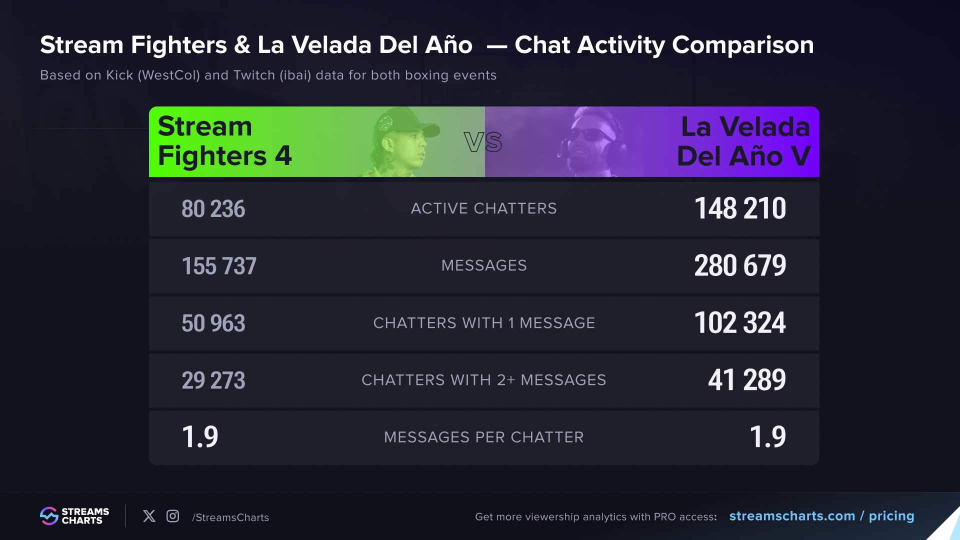 Entre las dos charlas en Kick y Twitch, tanto ibai como WestCol registraron 1,9 mensajes por participante en sus respectivos eventos de boxeo mediático de este año. Aunque ibai registró métricas más sólidas gracias a su mayor número de espectadores, los seguidores de WestCol en Kick obtuvieron un resultado comparativamente bueno; la métrica de usuarios activos de ibai para La Velada Del Año V solo fue un 85 % superior al resultado de WestCol en Stream Fighter 4, a pesar de que su métrica de espectadores medios fue más de un 220 % superior.