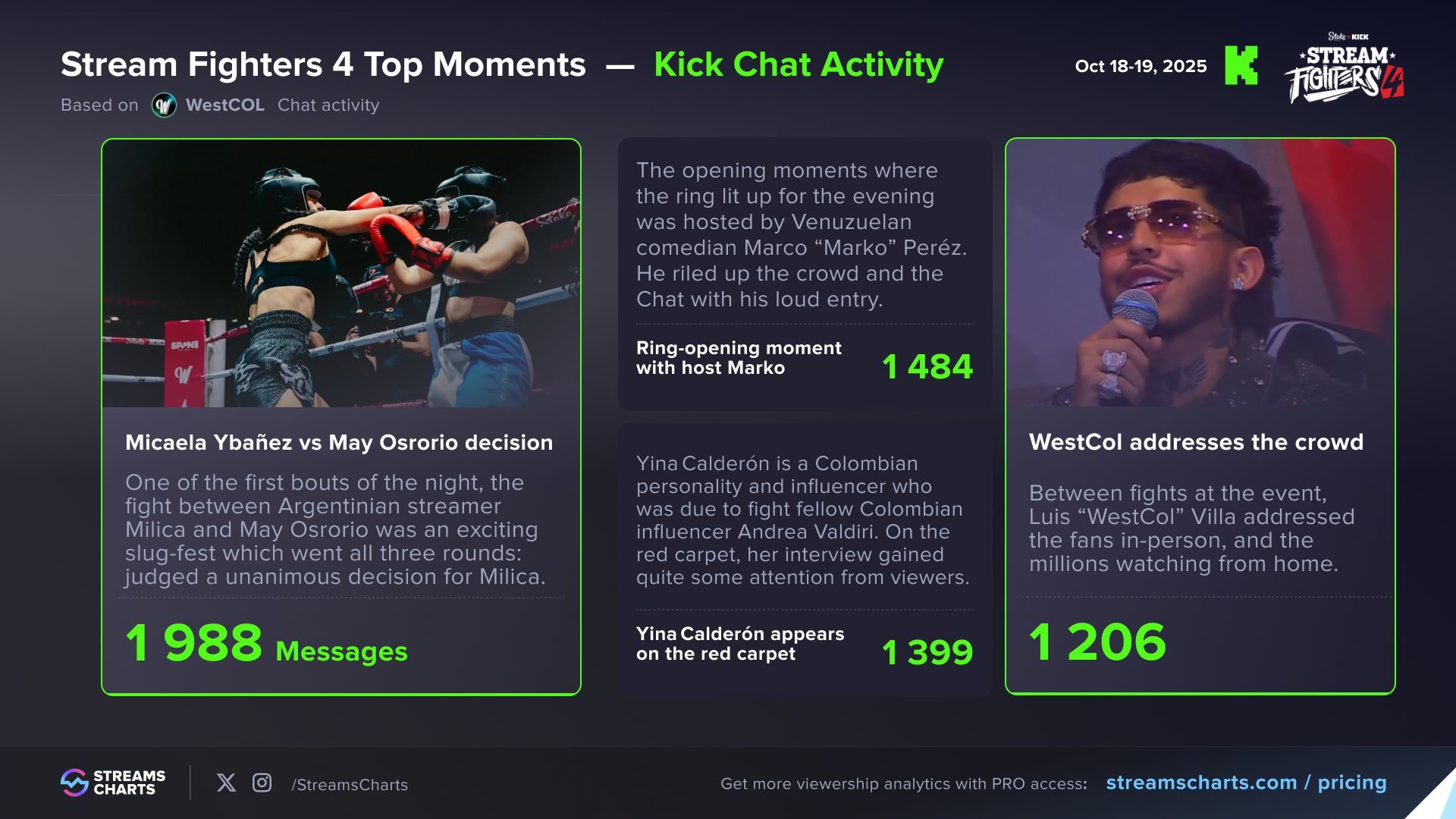 La sensación del streaming en directo Luis «WestCol» Villa batió recientemente récords en Kick con la cuarta edición de su serie de boxeo Stream Fighters. Stream Fighters 4 recibió millones de espectadores, estableciendo nuevos récords personales para WestCol y también un nuevo récord histórico para Kick. Desglosando la acción con nuestras últimas actualizaciones, Streams Charts ahora puede echar un vistazo a los datos del chat de Kick para los streamers de nuestra base de datos, ¡y también de YouTube Live!