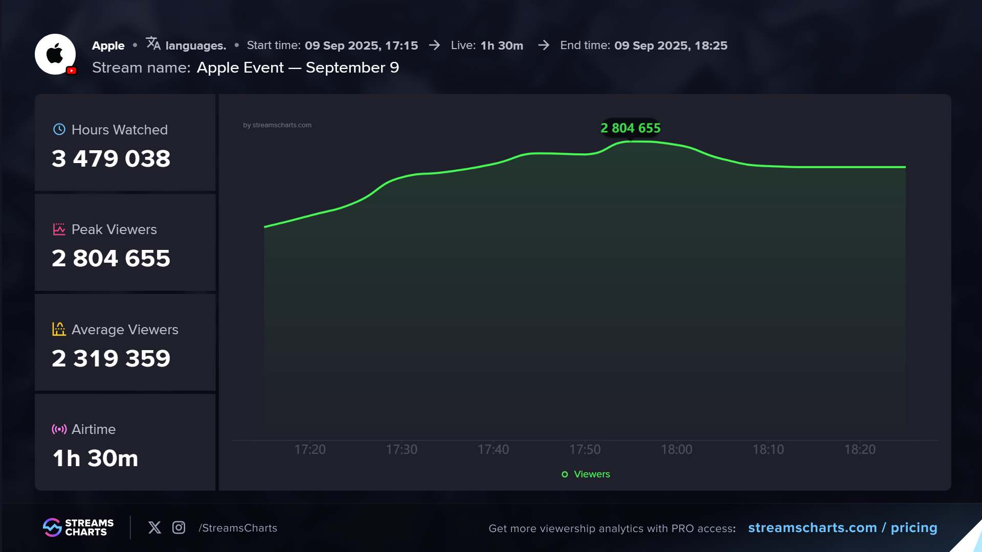 On September 9, Apple hosted its annual fall keynote to unveil the new iPhone 17 lineup. CEO Tim Cook introduced the latest iPhone and refreshed versions of the company’s headphones and smartwatch. The event was livestreamed on Apple’s official YouTube channel, reaching a peak of over 2.8 million viewers. Still, Streams Charts notes that the numbers fell short of Apple’s records.
