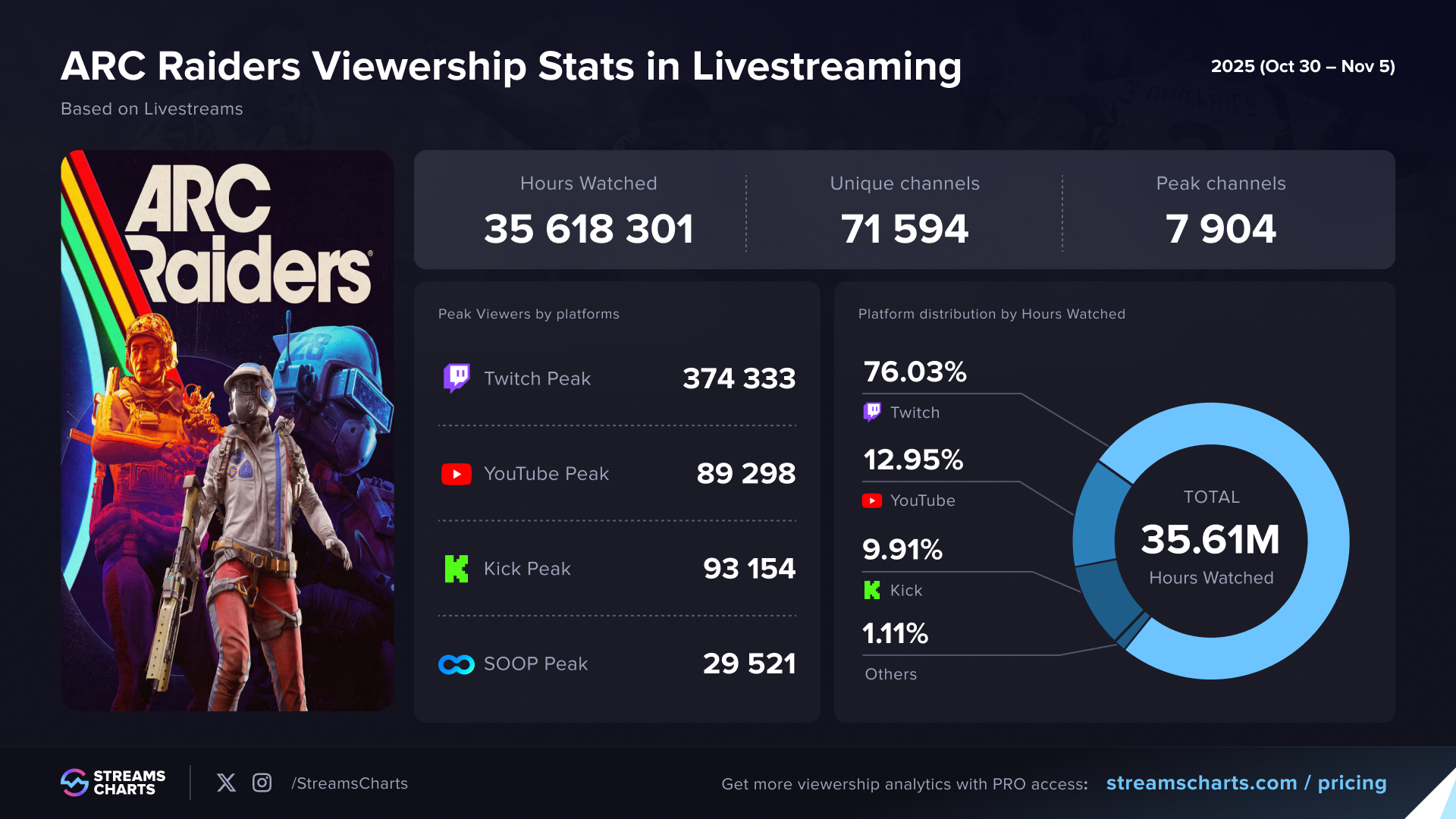 During its launch week, over 71,500 unique channels streamed ARC Raiders. Twitch dominated the scene, accounting for roughly 76% of all watch hours. The platform also topped the charts in peak viewership, attracting more than 374,000 concurrent viewers in the game’s category.