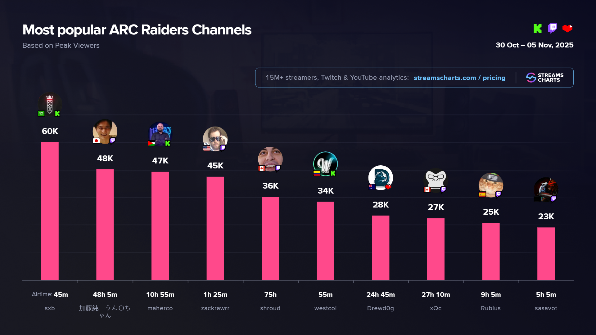 When it comes to peak concurrent viewership, Kick streamer Ahmed “sxb” Alqahtani from Saudi Arabia took the top spot. His ARC Raiders streams drew over 60,200 simultaneous viewers, making him the game's most-watched creator at its peak.