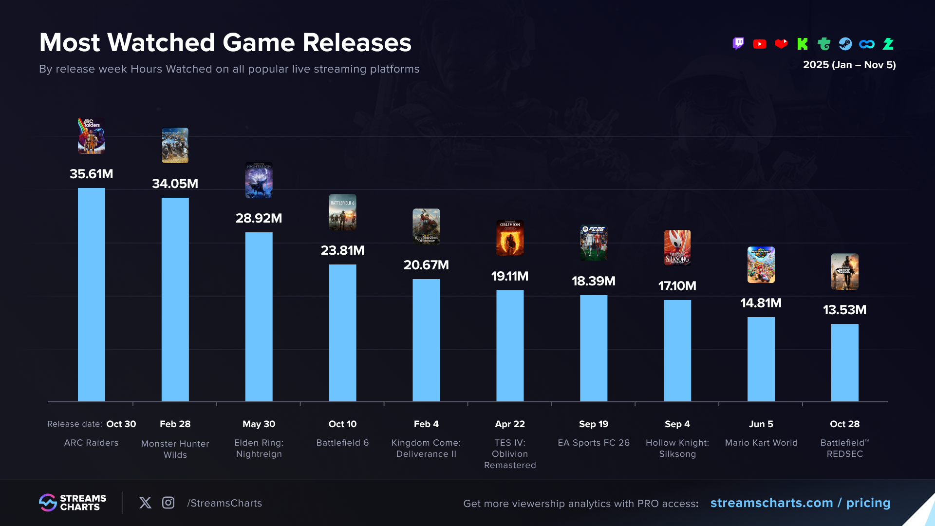 At the moment, ARC Raiders stands as the most-watched game release of 2025 — and it’s unlikely that any new title will dethrone it before the year ends.
