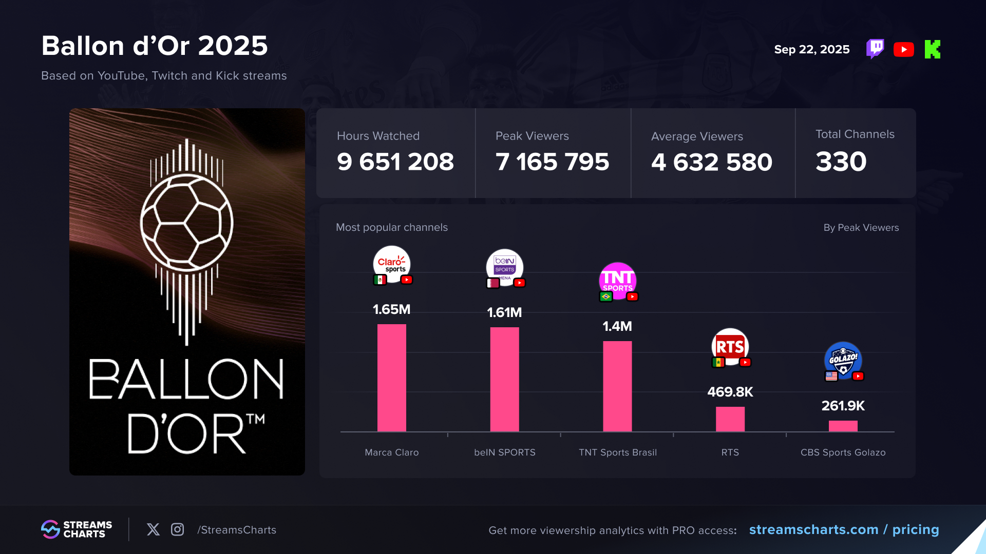 In terms of viewership, Ballon d’Or 2025 livestreams drew around 9.6 million hours watched, with peak concurrent viewership hitting 7.1 million across all platforms. For perspective, that’s just below the peak audience numbers seen during the Kamala Harris – Donald Trump debates in the most recent U.S. presidential election.