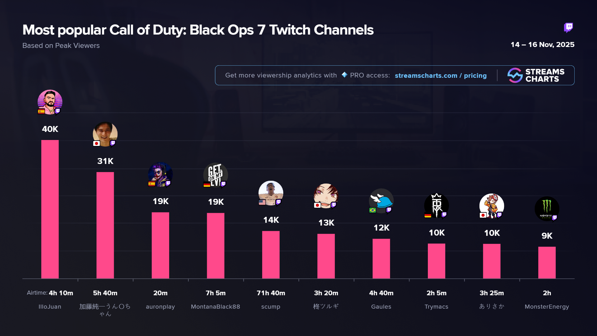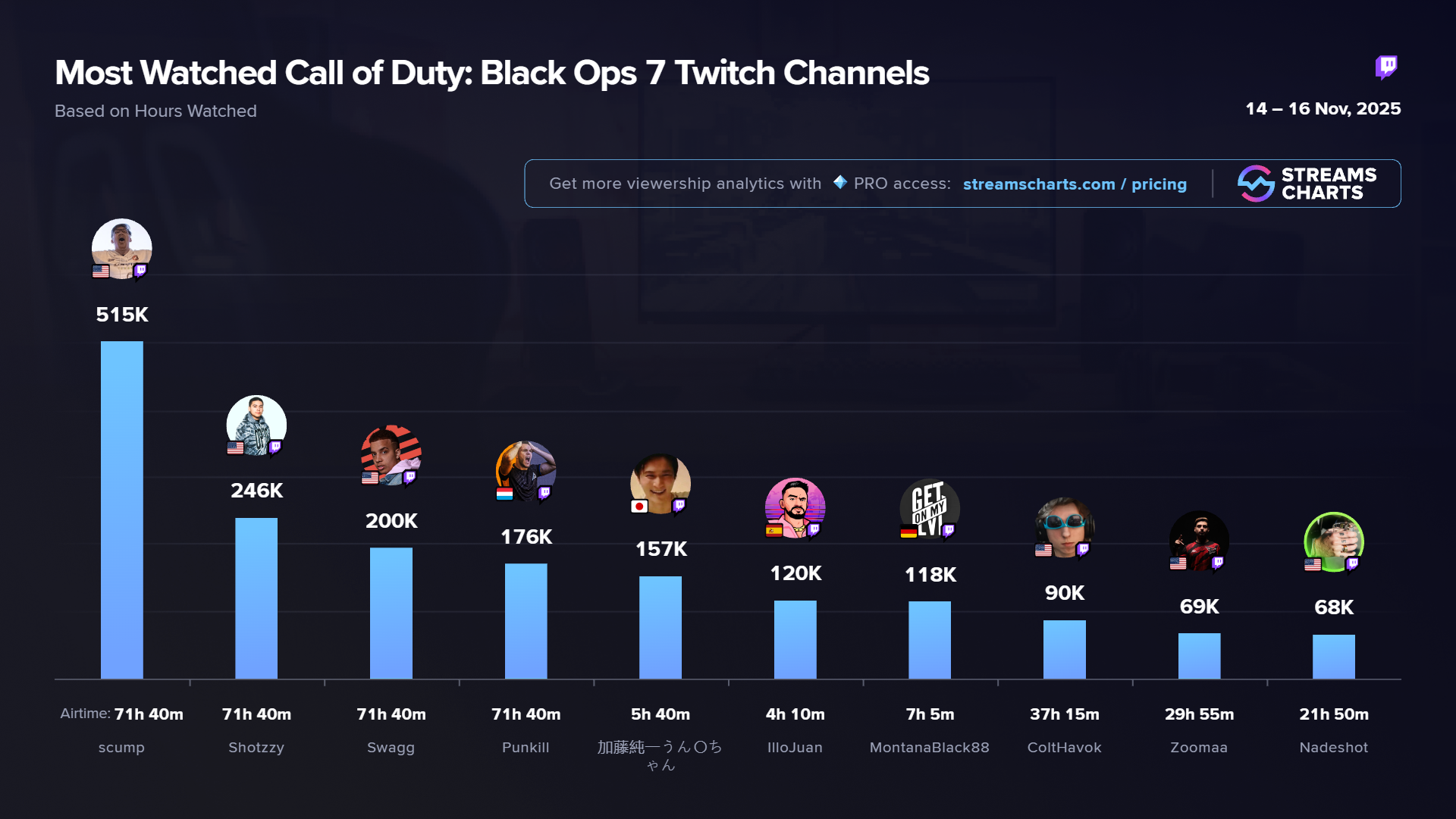 The top Call of Duty: Black Ops 7 streamer in terms of total watch time was Seth “scump” Abner, a former professional player and now one of the franchise’s most popular content creators. Hot on his heels were fellow U.S. esports streamers Anthony “Shotzzy” Cuevas-Castro and Kris “Swagg” Lamberson. However, the record for peak concurrent viewers went to Spanish streamer Juan Alberto “IlloJuan” García, who drew over 40,100 live viewers.