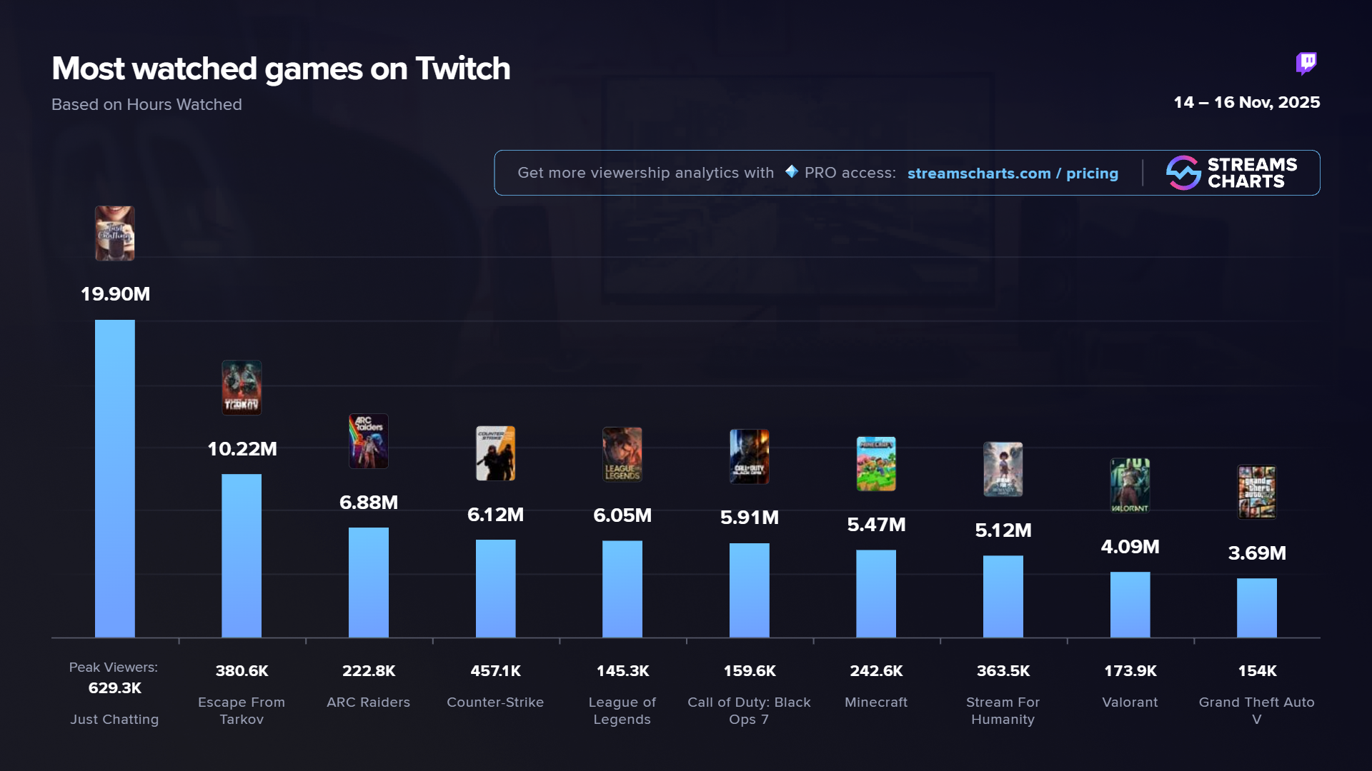 On launch day, the Call of Duty: Black Ops 7 racked up more than 2.2 million Hours Watched on Twitch. That was enough to push the game into the No. 2 spot among the platform’s most-watched titles, trailing only ARC Raiders. Over the full launch weekend (November 14-16), the category surpassed 5.9 million Hours Watched. It also slipped five spots in the rankings, falling behind Escape from Tarkov, Counter-Strike, and League of Legends.
