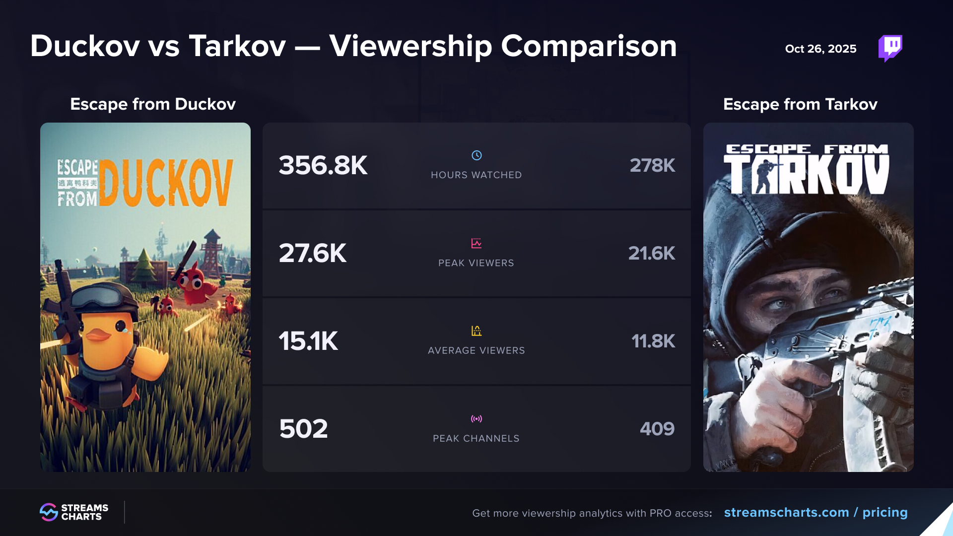 On Sunday, October 26, Escape from Duckov overtook Escape from Tarkov on Twitch across every key metric, including peak channel count. Importantly, this wasn’t just a lucky one-day spike. While Duckov started with modest numbers after launch, it showed steady growth throughout the first week and gradually caught up with Tarkov.