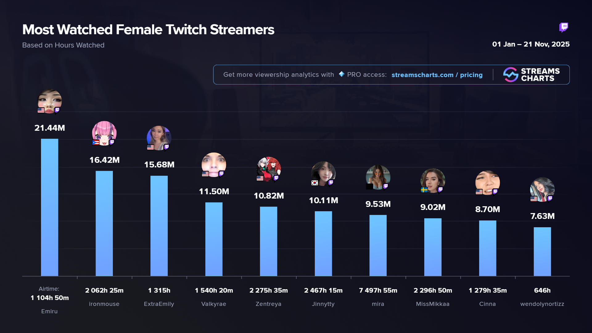 In 2025, ExtraEmily’s channel surpassed 15.6 million hours watched, making it the third-highest among female Twitch streamers, trailing only Emiru and Ironmouse, and placing 73rd overall on the platform. In May, she set a new personal record for peak concurrent viewers, drawing 55,739 fans during her Streamer University broadcast.