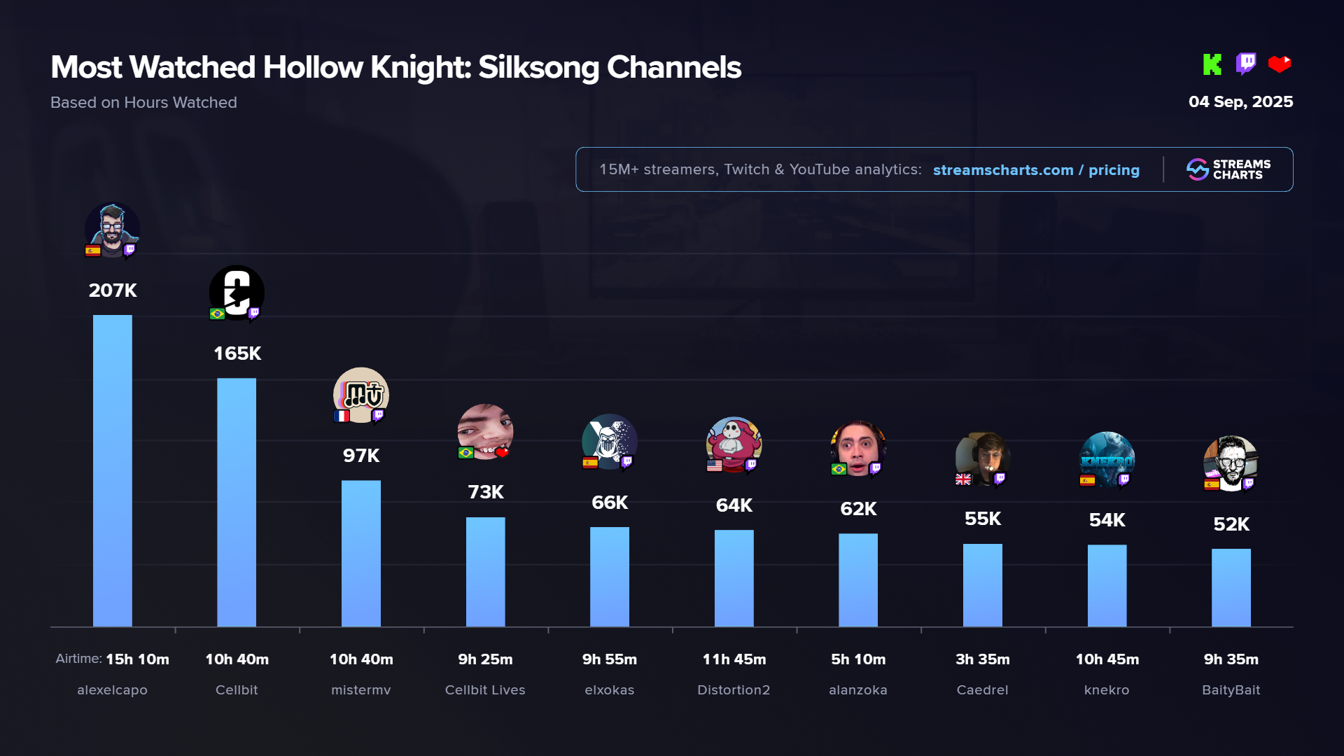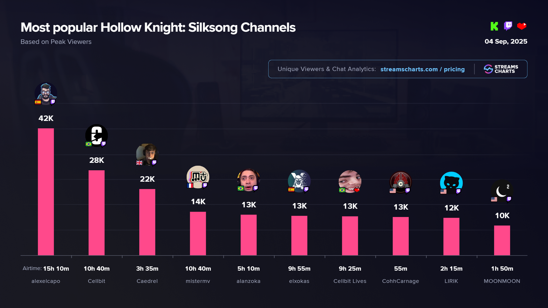 The launch of Hollow Knight: Silksong caught the attention of many top content creators. On Twitch, Spanish streamer Alejandro “alexelcapo” led the way on release day, topping both total watch hours and peak viewership for the game. Other notable streamers who showcased Silksong included Rafael “Cellbit” Lange, Alan “alanzoka” Ferreira, Marc Robert “Caedrel” Lamont, Ben “CohhCarnage” Cassell, and more.