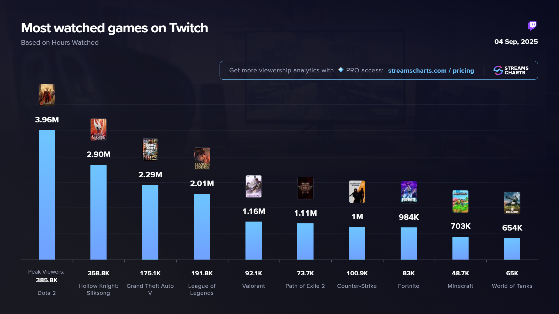 Hollow Knight: Silksong also crushed it on Twitch. On launch day, the game pulled in 2.9 million watch hours, ranking as the second most popular title on the platform. The only game ahead of it was Dota 2, which dominated thanks to the kickoff of The International 2025. The Silksong category averaged 125,200 viewers, peaking at 358,700 concurrent watchers. In both metrics, it trailed only Dota 2 while leaving every other game far behind.