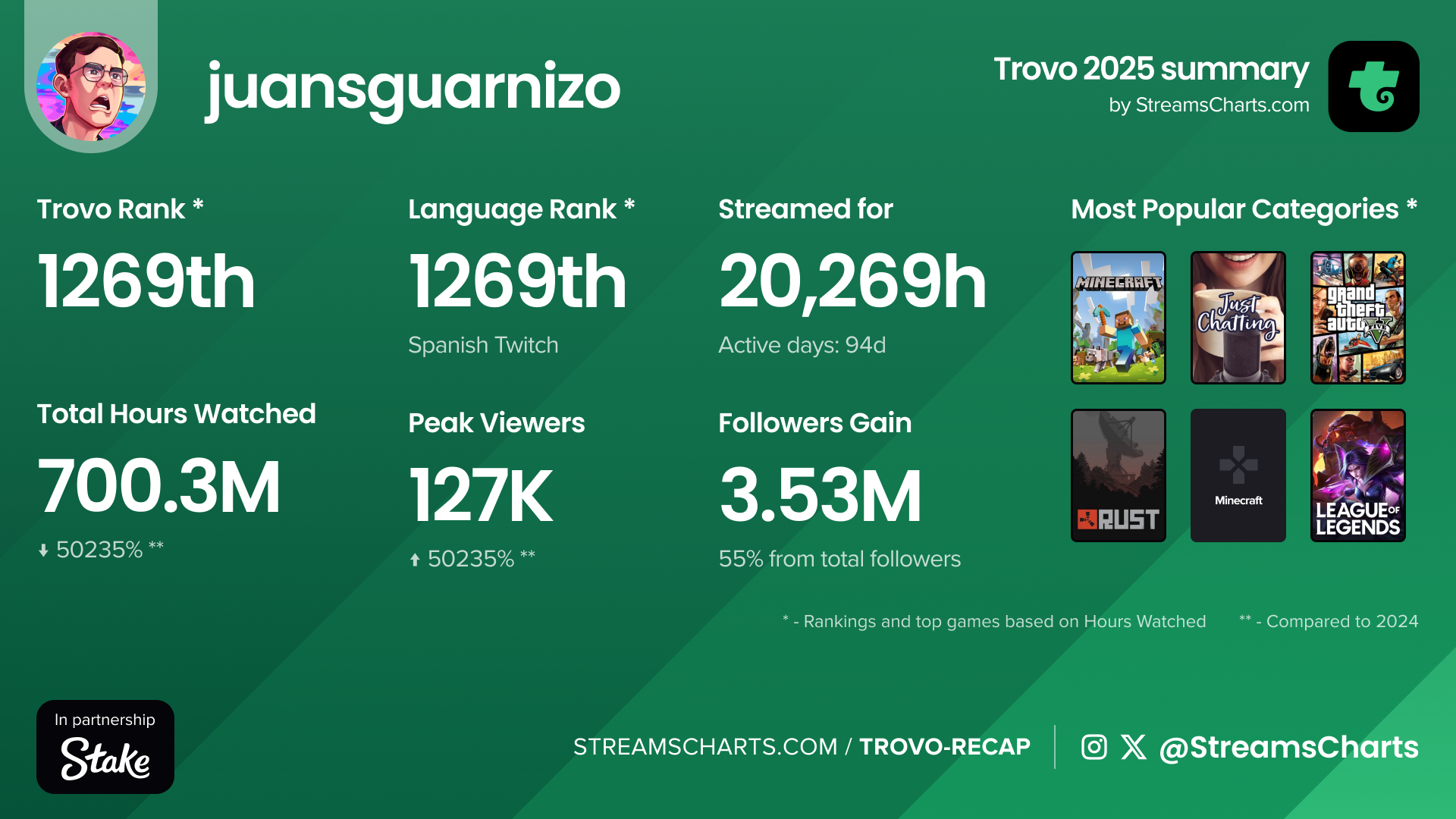 The Trovo Recap gives creators a complete look at their year on the platform. It surfaces a broader range of performance metrics, from your overall watch-time rank on Trovo to your placement among channels in your primary language. You’ll find a clear breakdown of your total watch time, hours streamed and how many new followers joined you in 2025.