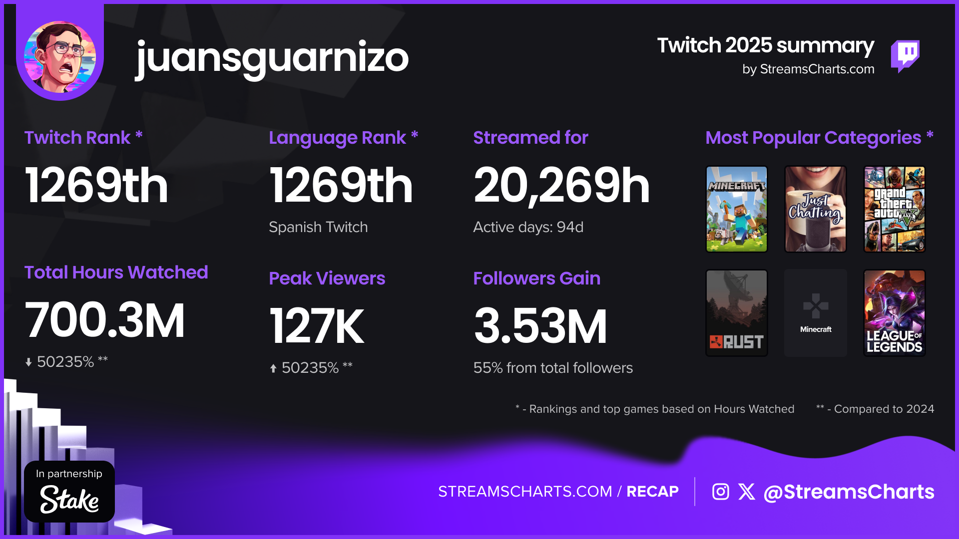 This year’s Twitch Recap showcases key livestreaming metrics like watch time, peak concurrent viewers, category performance, and follower growth. You’ll also be able to compare your progress year over year and see fun visual highlights of your achievements. That includes things like how many fully packed IMAX theaters your audience would fill, or how many hours of a “regular” job your streaming time adds up to.