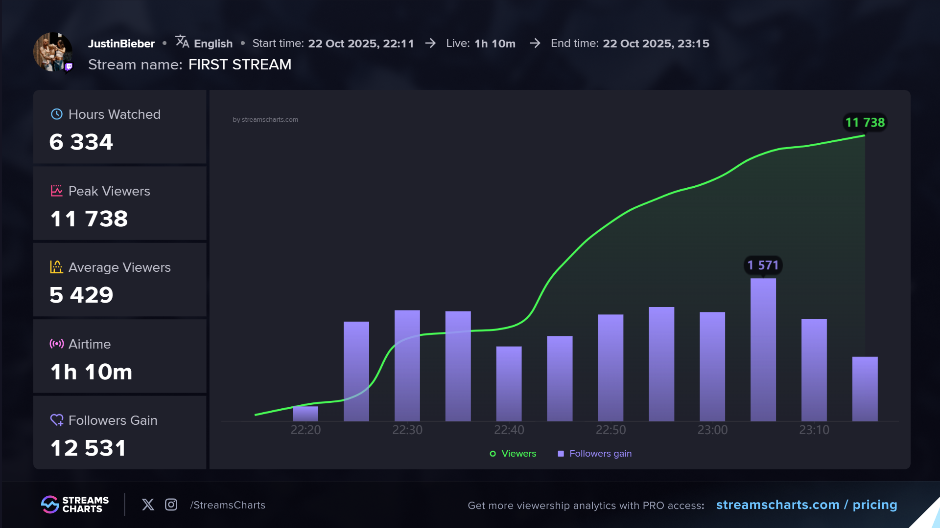 Bieber’s first Twitch stream lasted a little over an hour. During that time, his channel averaged around 5.4K viewers, with a peak of 11.7K. Following the debut, more than 12.5K new followers joined his Twitch channel. The strong start was largely thanks to Bieber promoting the stream on his X (formerly Twitter) page, where he boasts over 107.6 million followers.