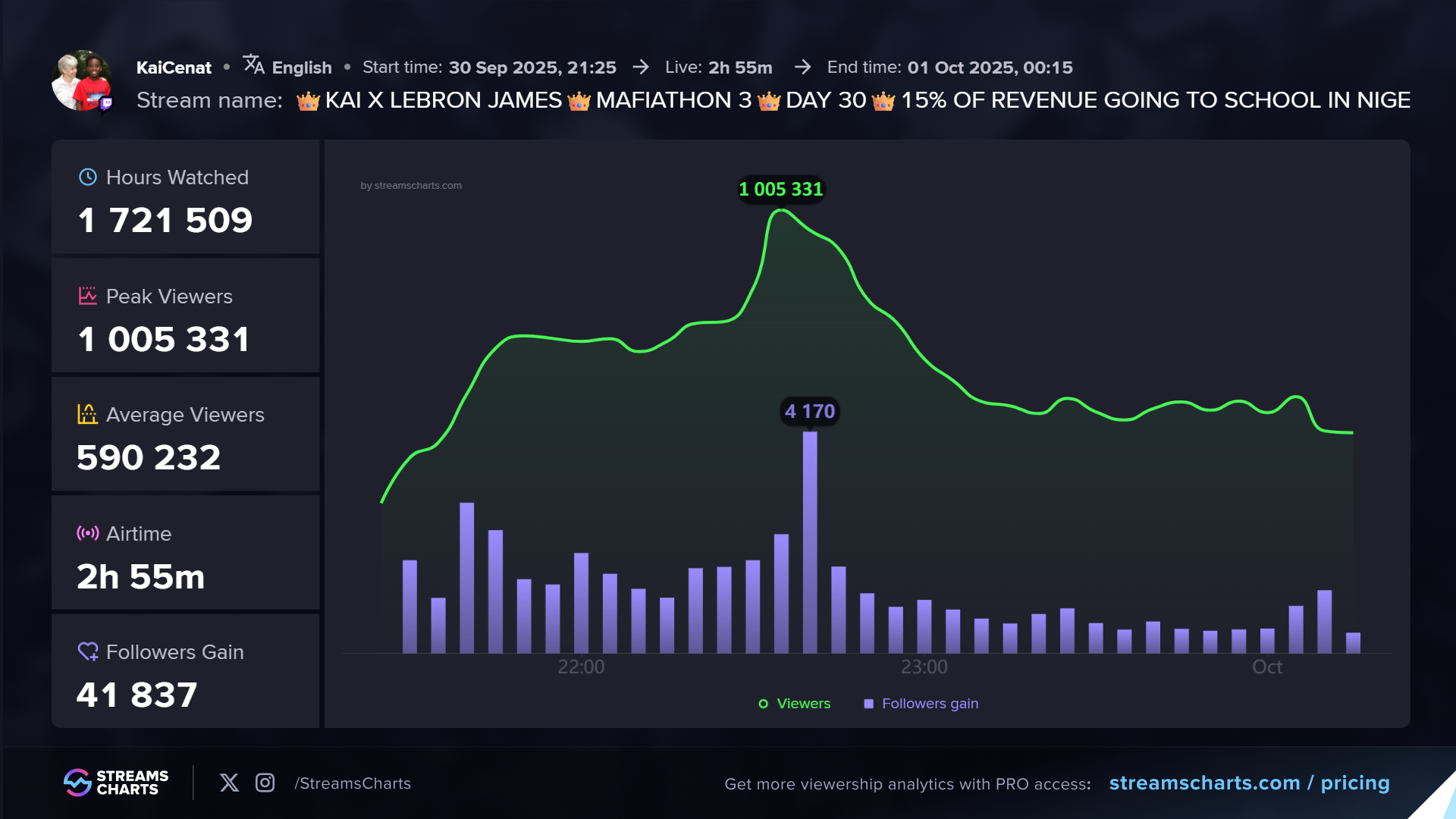 Kai Cenat is dominating the streaming scene this fall. He recently became the most-followed streamer on Twitch and has just completed his 30-day Mafiathon 3.0, during which he broke the record for paid subscriptions. But he didn’t stop there — on the final day of his legendary subathon, Cenat brought NBA superstar LeBron James onto the stream, and together, they set a new all-time peak viewership record for his channel.