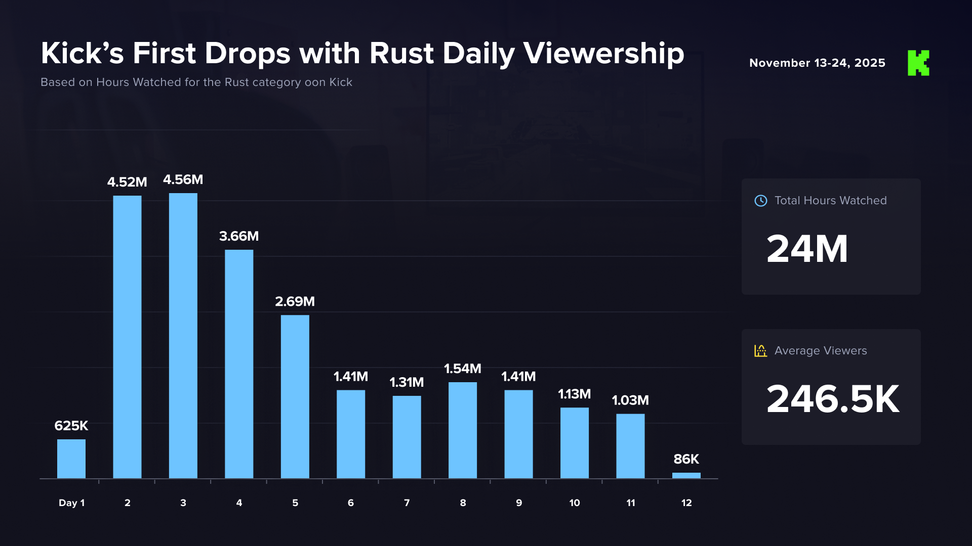 For the Rust category on Kick, 24M Hours Watched were generated throughout the Drops-enabled period, marking an increase of over 2500% compared to the start of November. Average Viewers (AV) also increased by a similar margin, totalling over 80,000 concurrent viewers, or over 1,000 Viewers per Channel. Thanks to this wave of excitement, Rust was the second-most-watched category on Kick for this time.