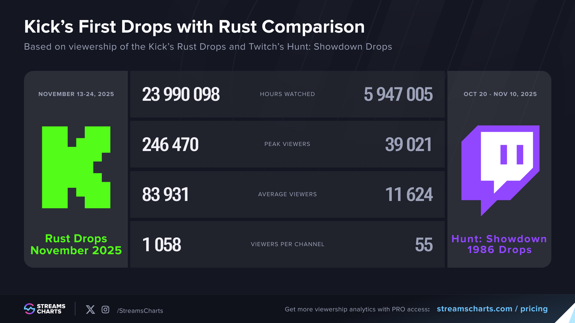 Comparatively, the recent Drops campaign outperformed Twitch's most recent Drops integration, which featured Hunt: Showdown 1986. While the campaign still performed well on Twitch, it was overshadowed by the massive success achieved on Kick with their Rust collaboration.