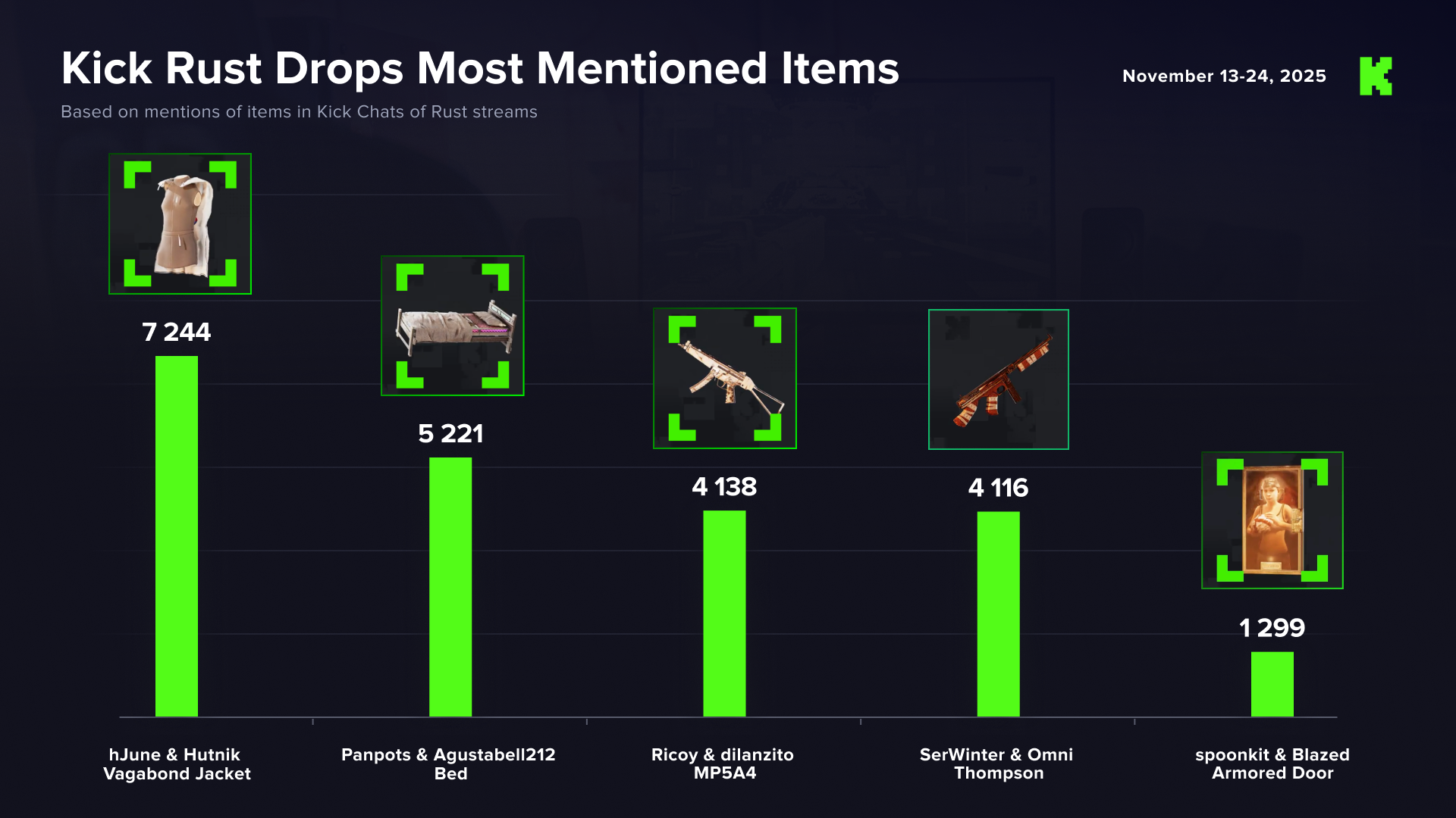 Making use of our newly updated Chat analysis tool, which now covers Kick and YouTube Live, we can take a look at which of the unique items for this Kick Drops campaign garnered the most attention. The Vagabond Jacket was the most popular item, being mentioned over 7,200 times in Kick Rust chats throughout the campaign, and it is no conidence that Harrison "hJune" Park was one of the top streamers of the entire campaign.