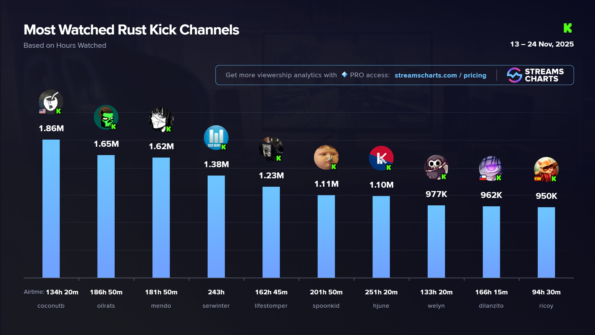 In collaboration with Facepunch Studios (Rust), Kick hosted their first-ever Drops campaign to great success from November 13 to 24. The event generated significant buzz for the livestreaming platform, and saw viewership increase under the Rust category by a factor of 25. Streams Charts presents a look at how this inaugural Drops campaign engaged viewers and boosted stats for Kick.