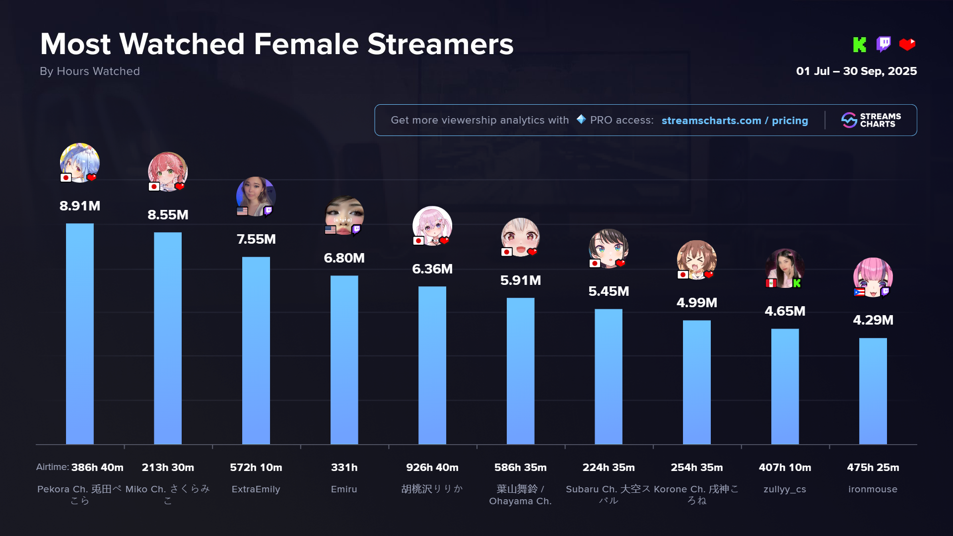 The rest of the leaderboard stayed mostly the same. VTubers still dominate watch hours, claiming 7 of the top 10 spots among female streamers. Among non-VTubers, Emiru and Valkyrae slipped slightly in watch hours, while ijenz managed to grow her numbers. Overall, there were no major shake-ups — most of the leaders held their ground, and breaking into the top tier remains a tough challenge for newcomers.