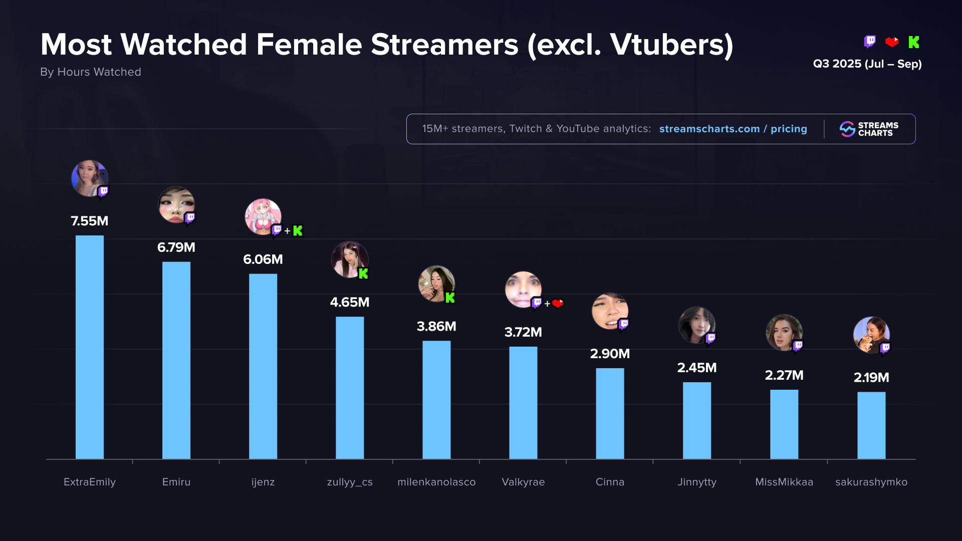 Most Watched Female Streamers in Q3 2025, swipe to exclude VTubers