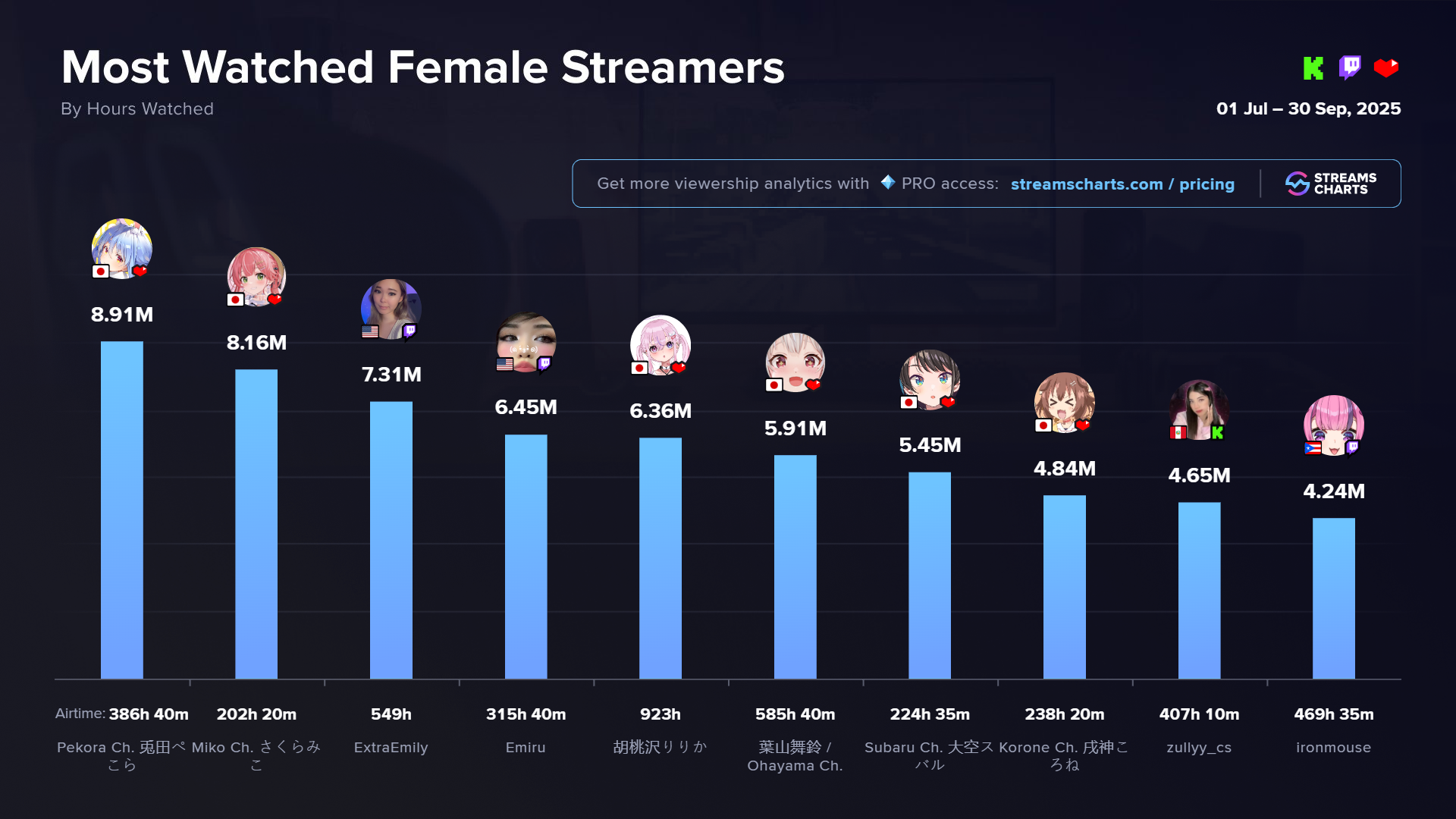 A new leader emerged among female streamers in Q2 2025: Miko Ch. overtook Pekora Ch. to claim the top spot in the first-half rankings. Both VTubers — part of the hololive agency — remain incredibly active and are the only female streamers so far to surpass 20 million Hours Watched this year.