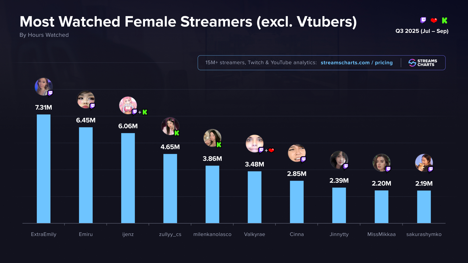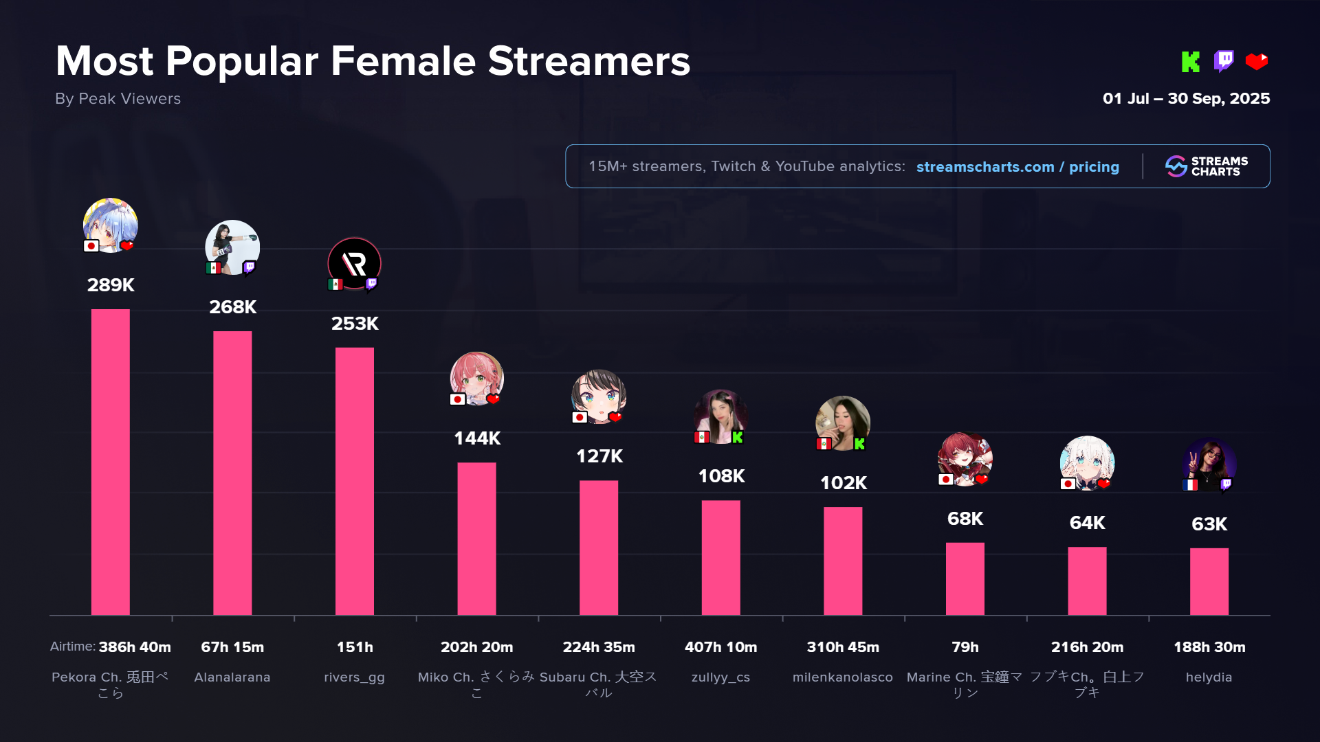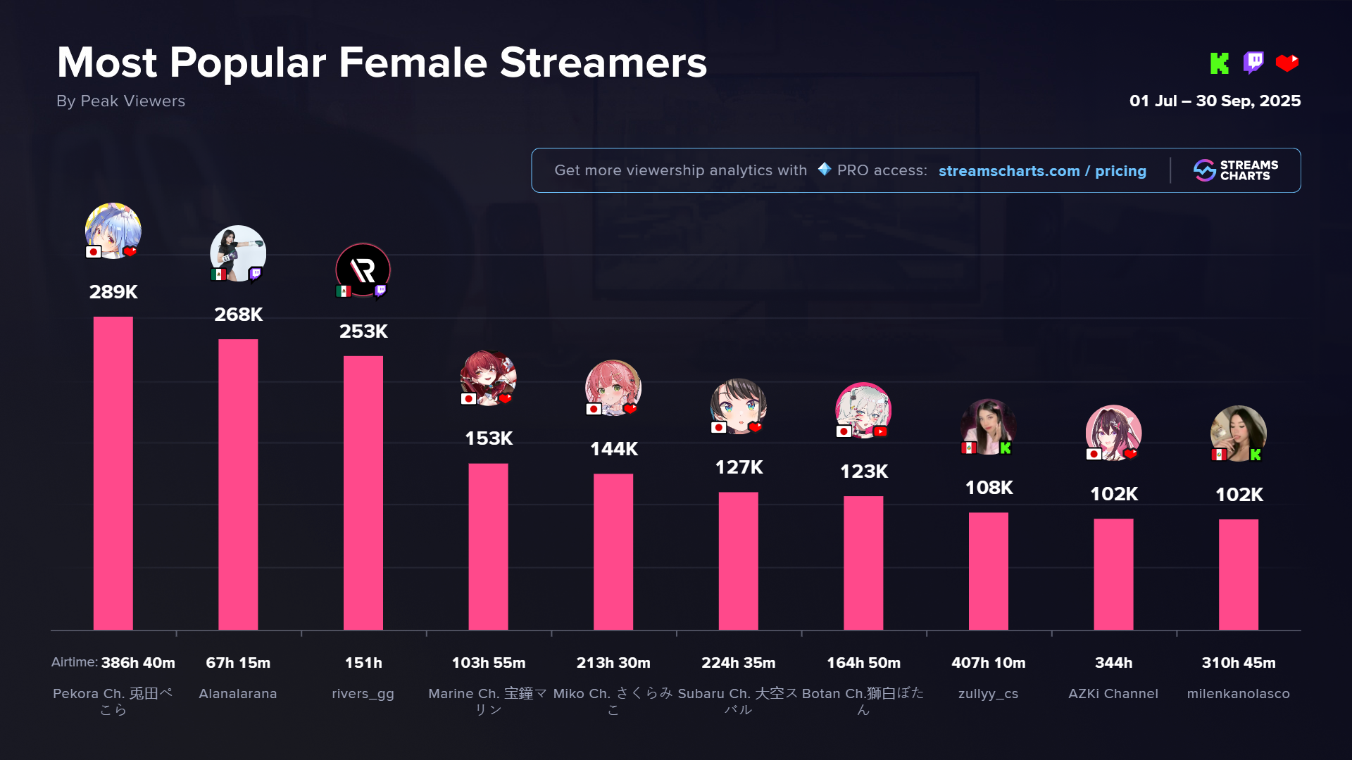 Most Popular Female Streamers in Q3 2025, swipe to exclude VTubers