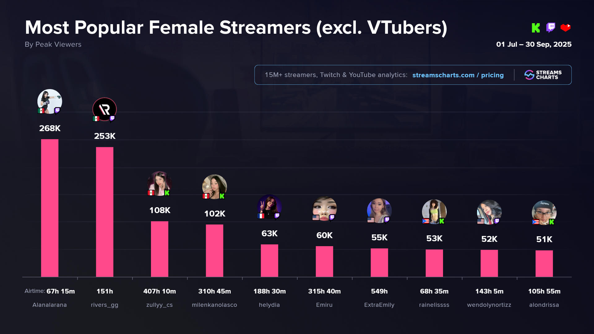 Alanalarana was the most popular non-VTuber female streamer in Q3 2025. In August, she competed in the Supernova Origines boxing showcase, facing off against Mexican actress Gala Montes. The fight was highly entertaining, and her stream of the match peaked at 268.1K viewers — a record for her channel.