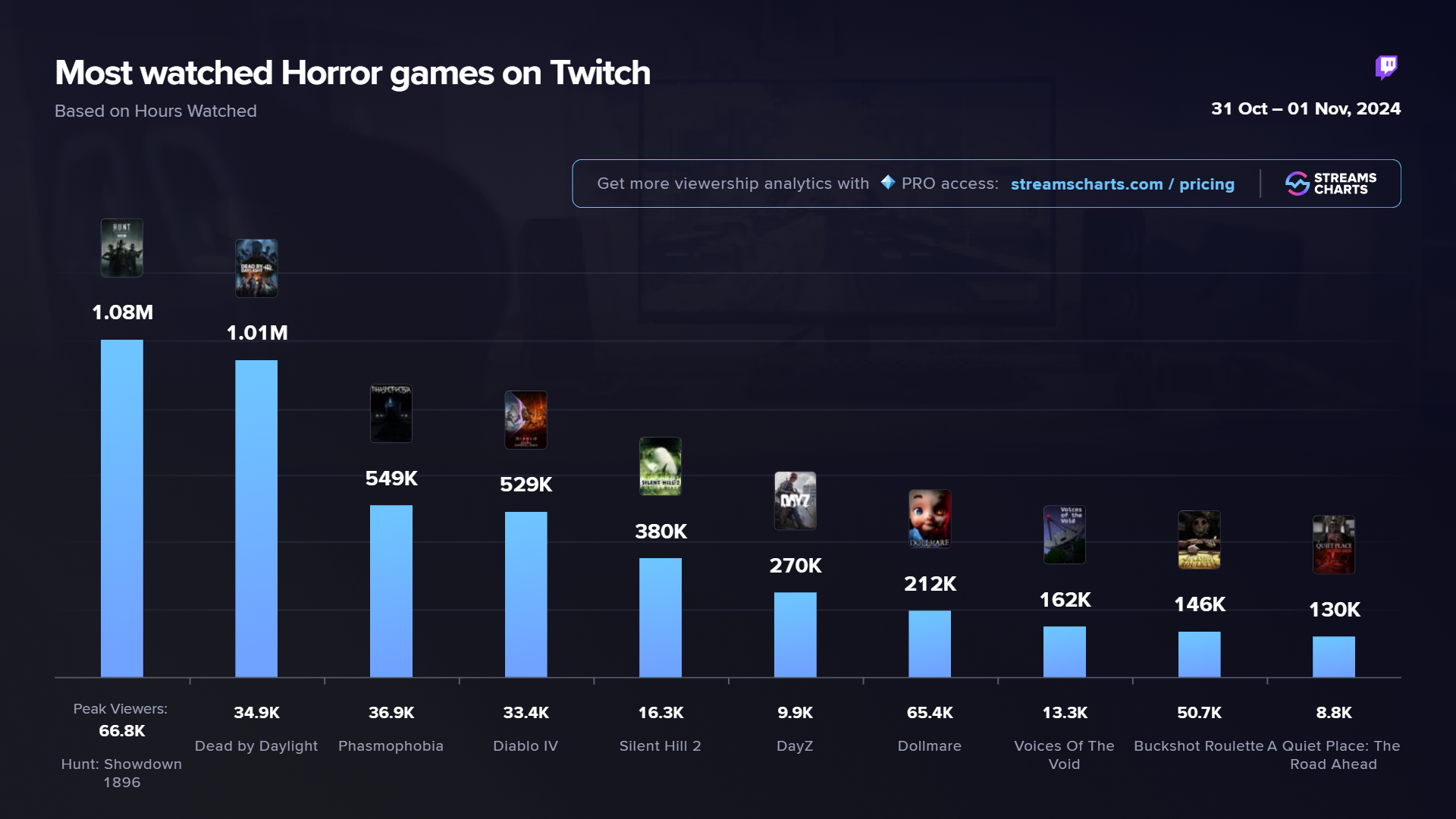 Hunt: Showdown 1896 became the most-watched horror game on Twitch during Halloween 2024. Over just two days (October 31 – November 1), the game’s category generated more than 1.08 million hours watched.