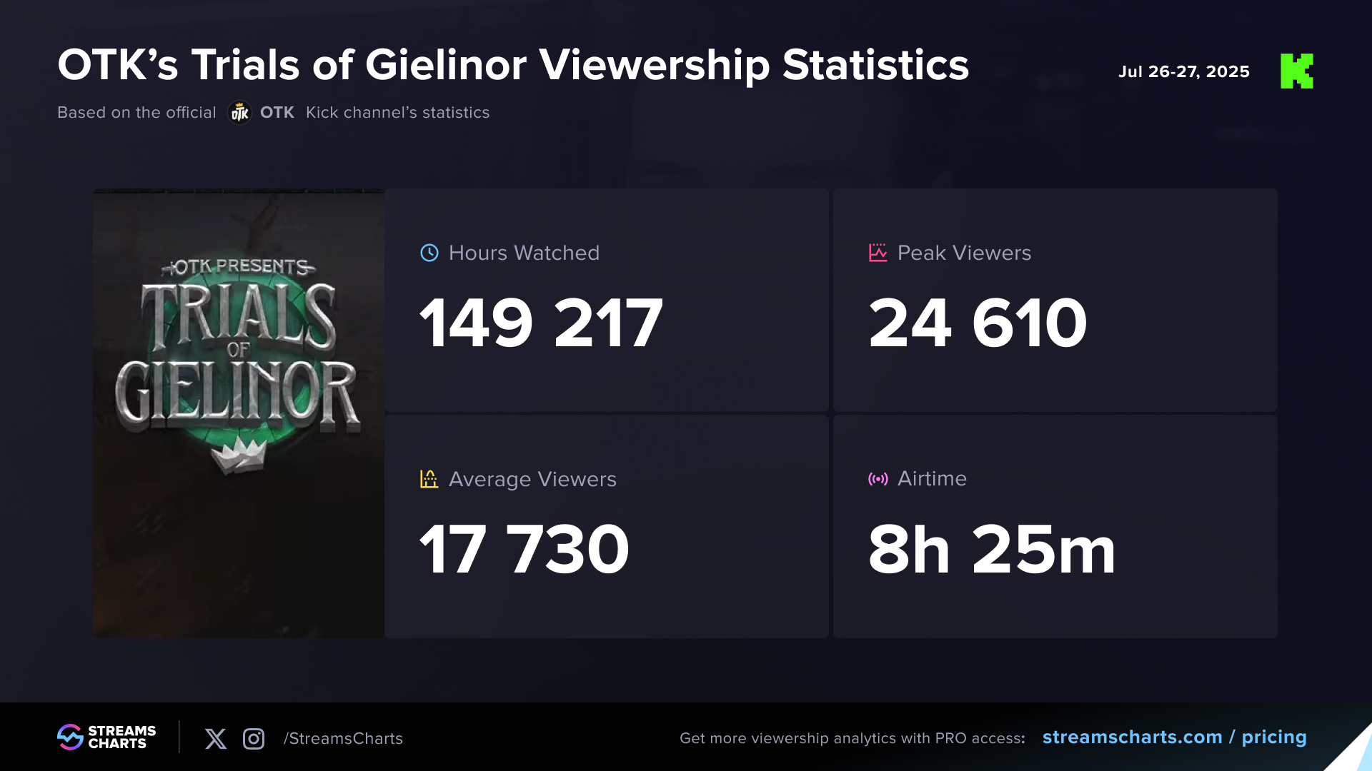 For their second livestreamed event, the OTK Kick channel held the official broadcast for their Trials of Gielinor event. Named after the fictional world of Runescape, the event saw established Runescape streamers join forces with less experienced streamers, coming from other MMORPG backgrounds, most commonly World of Warcraft. The Trials of Gielinor saw all of these streamers come together to fight for the top spot.