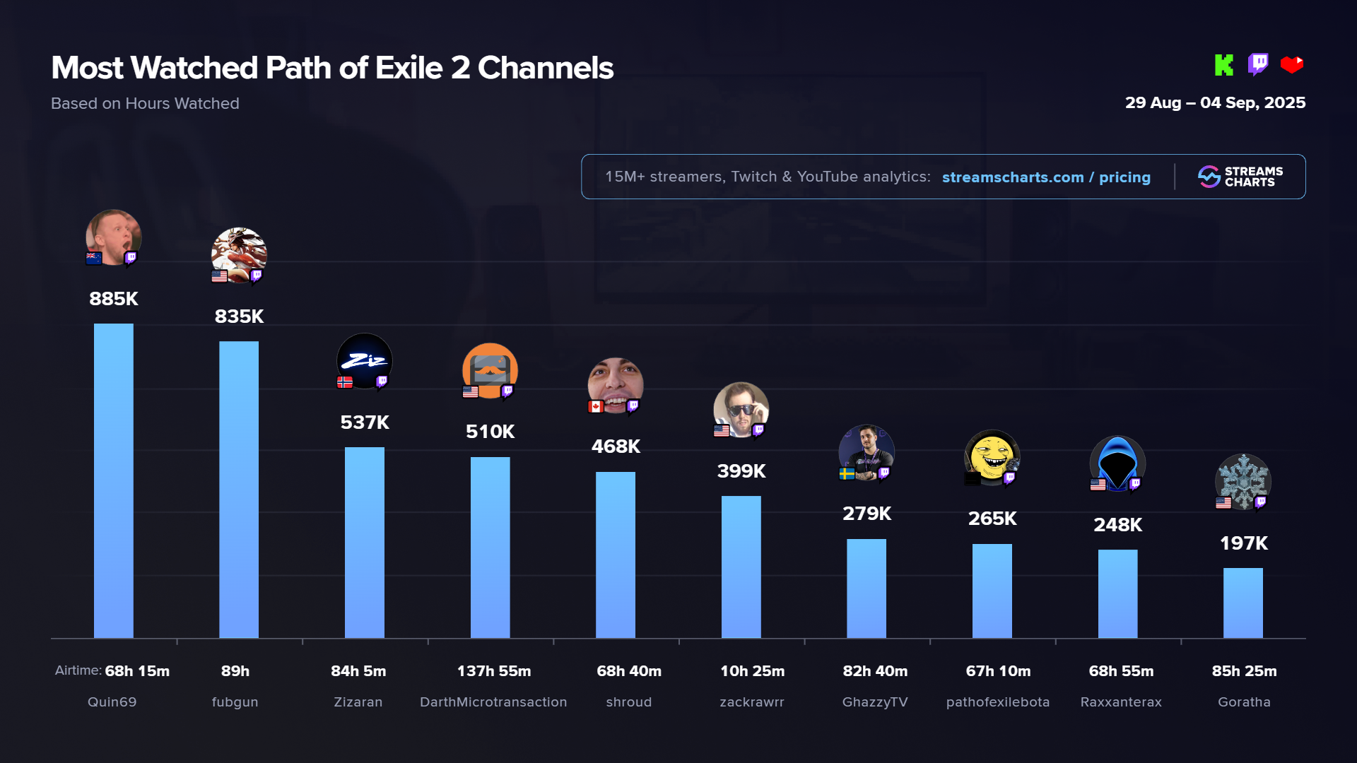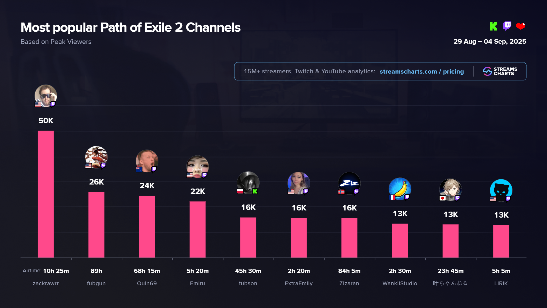 The top Path of Exile 2 streamer last week was Australian Quin69, racking up nearly 885K Hours Watched. Among female streamers, ds_lily led the pack with 97.4K hours and ranked 28th overall across all streamers. However, the most-popular single stream was zackrawrr’s launch broadcast, which peaked at 50.1K concurrent viewers.