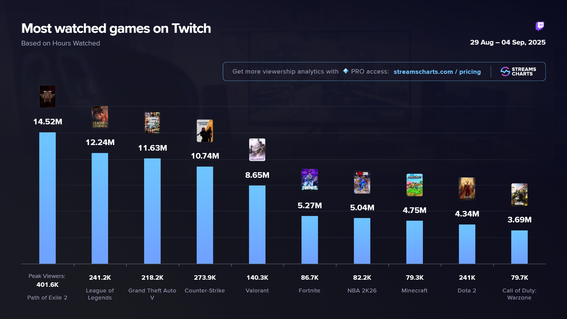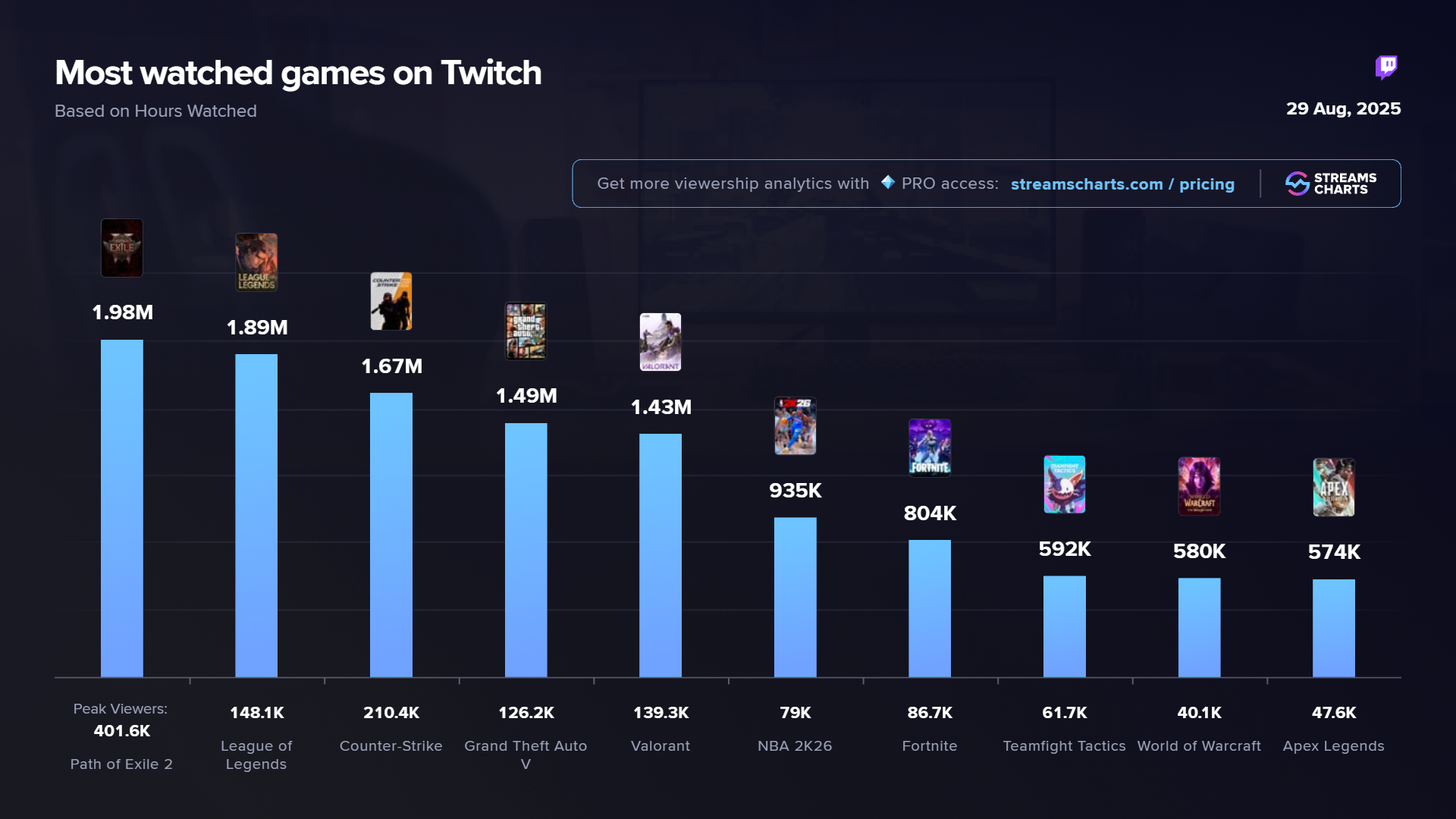 On August 29, The Third Edict launch day, Path of Exile 2 racked up over 1.98 million Hours Watched on Twitch. That total was enough to surpass long-time chart leaders like League of Legends, Grand Theft Auto V, and Counter-Strike.