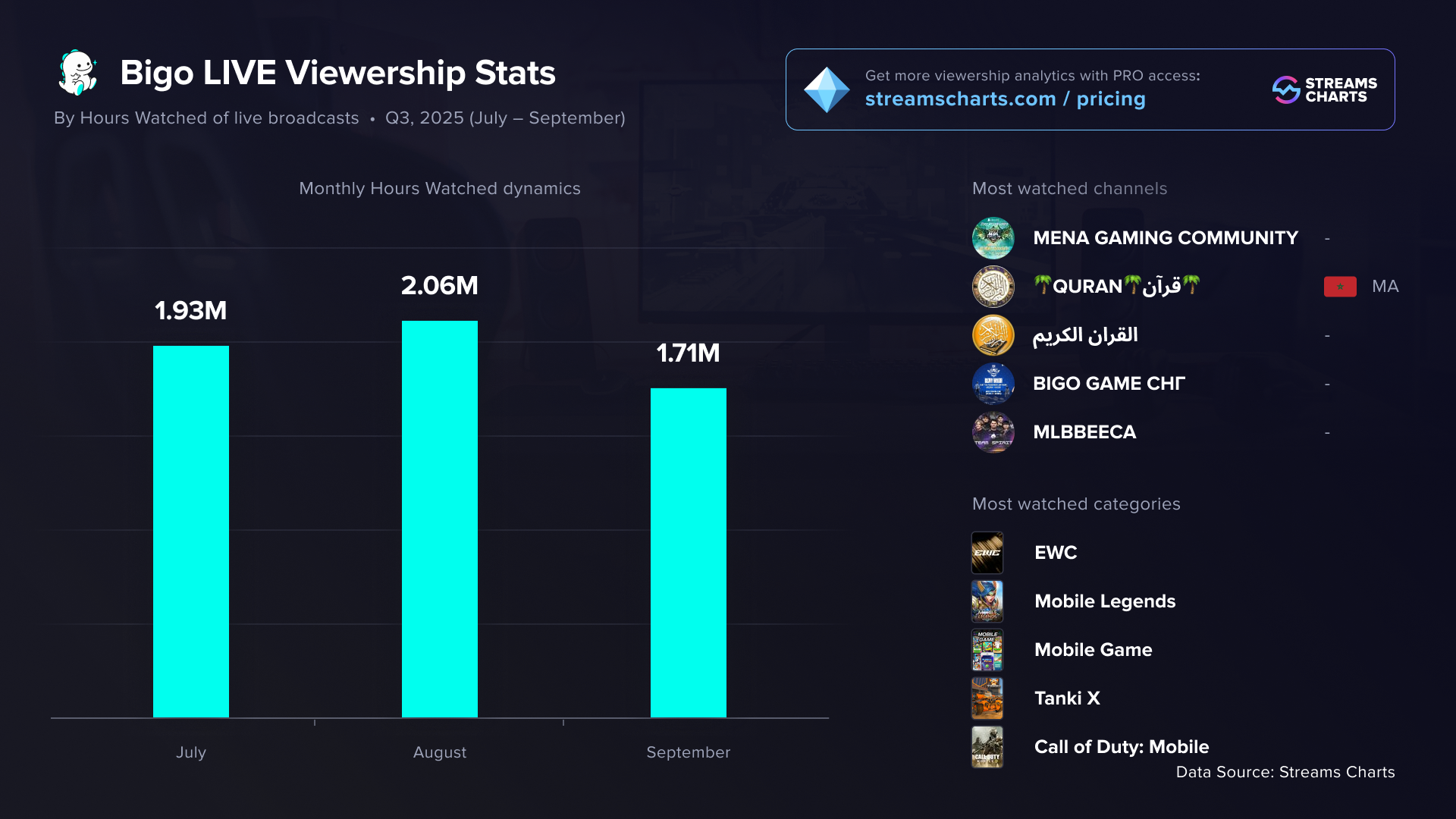 This summer, particularly in August, Bigo Live saw a bit of a boost. Esports broadcasts from the Esports World Cup helped the platform achieve its best numbers of the year for Hours Watched, average viewership, and peak viewers.