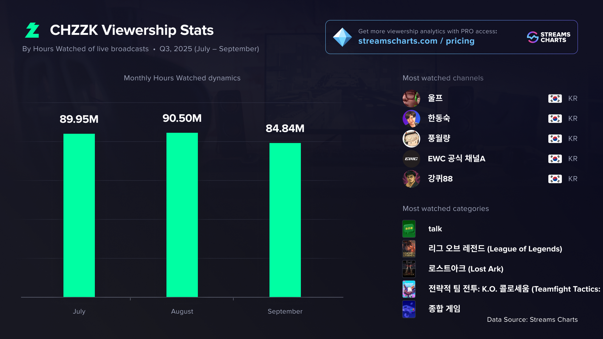 The past quarter was a strong one for Korea’s CHZZK platform. Total Hours Watched grew by 2.7%, but the real highlight was a new peak viewership record — on July 20, CHZZK drew 538,000 concurrent viewers. Most of them tuned in for the League of Legends grand final at the Esports World Cup 2025, where Gen.G Esports faced off against AG.AL International.