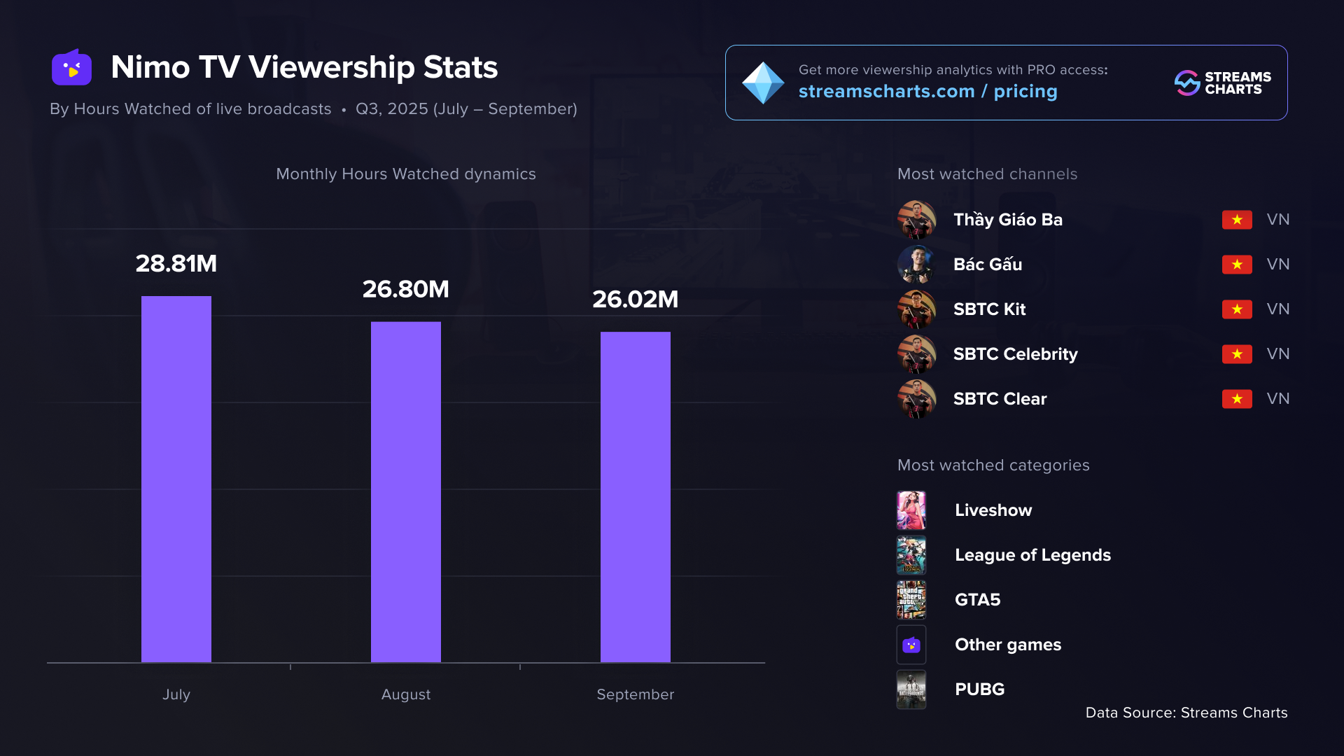 In Q3 2025, NimoTV nearly stopped broadcasting esports altogether, featuring only a handful of events for PUBG: Battlegrounds and CrossFire. Notably, there were almost no League of Legends tournaments — despite the game’s huge popularity among NimoTV’s Vietnamese audience and the presence of several well-known LoL streamers on the platform.