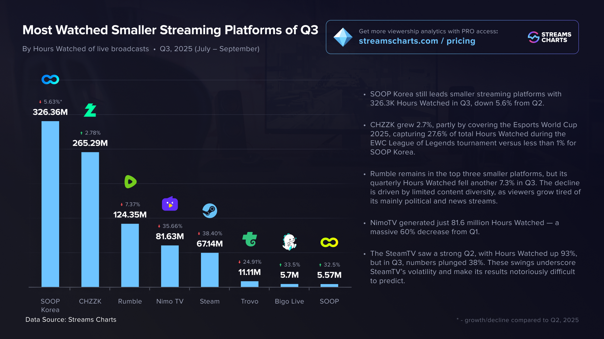 Among smaller streaming platforms SOOP Korea continues to dominate with 326.3K HW, CHZZK grew 2.7%, Rumble and NimoTV are declining, and platforms like Trovo, Bigo Live, and SOOP Global remain volatile.