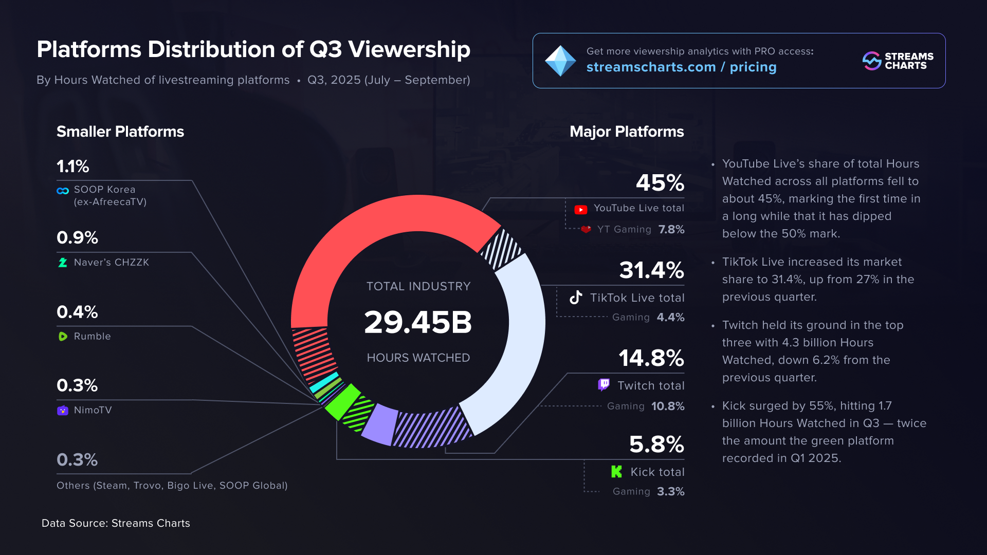 Livestreams across all major platforms reached 29.45 billion Hours Watched in Q3, down only 0.5% from Q2, highlighting the industry’s overall stability.