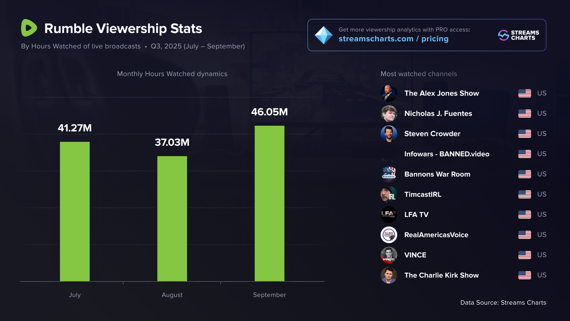 Rumble’s metrics — including Hours Watched, peak viewership, and peak channel counts — have been steadily declining month after month. Even so, the platform still reacts strongly to major political events. In September, for example, the murder of political activist Charlie Kirk dominated discussions across Rumble’s political talk shows and podcasts.
