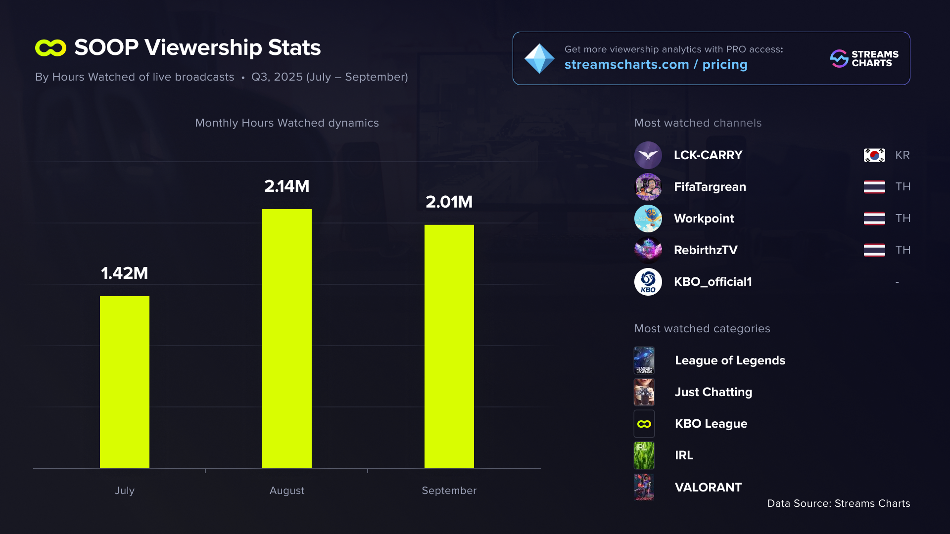 SOOP Global continues to hold the last spot among the top smaller streaming platforms. In the past quarter, it generated just 5.5 million Hours Watched — up 32.5% from earlier results. While its audience is modest, viewers still enjoy esports streams, keeping up with League of Legends and Valorant tournaments, as well as KBO (Korea Professional Baseball League) games.