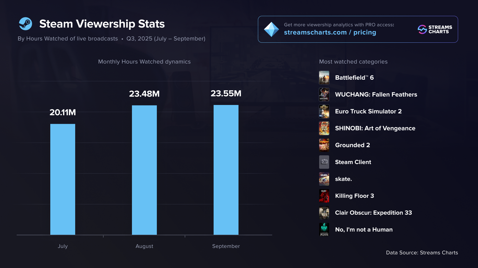 SteamTV’s decline might have been even steeper, but the launch of WUCHANG: Fallen Feathers and, notably, the Battlefield 6 beta helped soften the drop. It’s very likely that the EA shooter will return to the top of SteamTV’s categories in the next quarter.