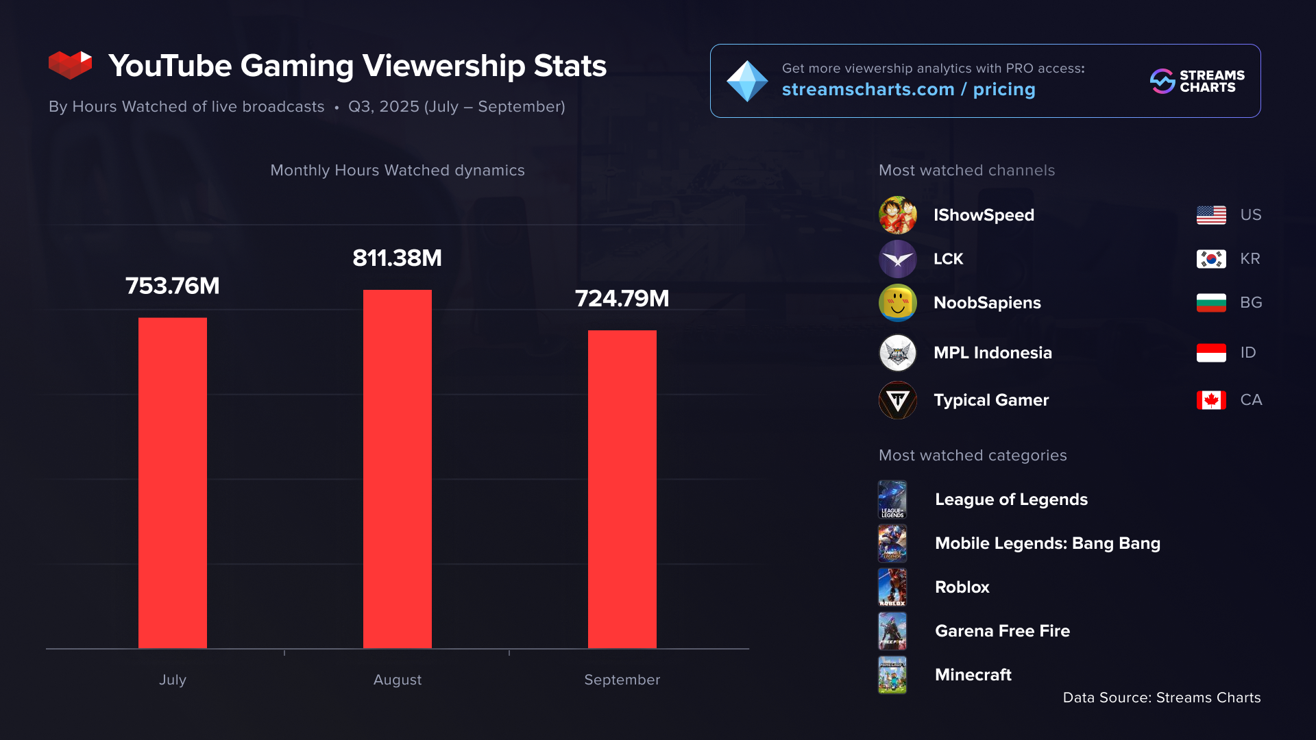 YouTube Gaming streams totaled around 2.28 billion Hours Watched in Q3. Viewer activity peaked in August, coinciding with the start of the summer stages of LCK and LEC. The MLBB Mid Season Cup 2025 final, held at the start of the month, also contributed to the spike. Overall, the top channels indicate that League of Legends and Mobile Legends: Bang Bang continue to dominate as the platform’s primary esports titles, remaining major drivers of YouTube Gaming viewership.
