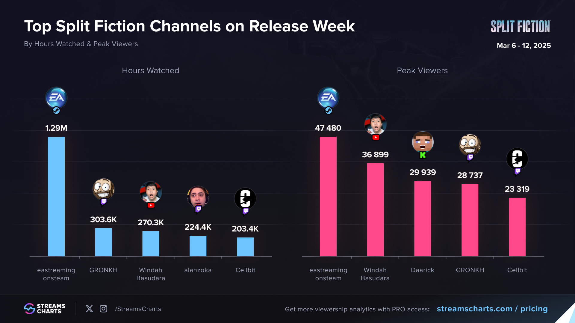 On other platforms, the Twitch streamer with the largest Split Fiction following was Erik ‘’GRONKH’’ Range, a popular content creator from Germany. He played in Split Fiction together with Max ''PhunkRoyal''. On YouTube, the top streamer was Windah Basudara from Indonesia, known for playing through popular story-driven titles on his streams. He played the game with his friend.