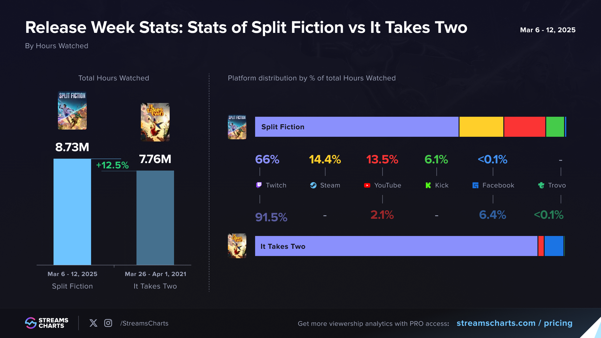 According to Streams Charts, Split Fiction generated 12% more watch hours in its first week after release than It Takes Two. The peak viewership for Split Fiction was 25% higher, and in terms of the number of unique channels streaming the game, it outpaced It Takes Two twice.