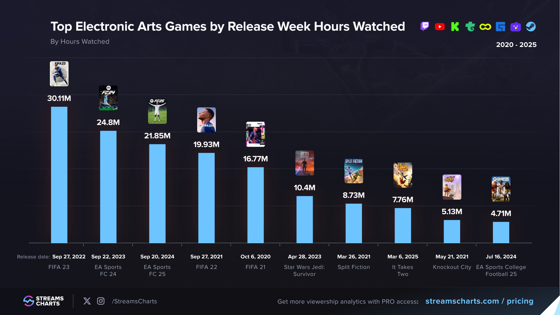 Split Fiction ranked seventh in total watch hours during its first week among all titles published by EA Games during 2020 - 2025. If you exclude sports simulators (FIFA / EA Sports FC) from this ranking, the game would take second place, just behind Star Wars Jedi: Survivor.