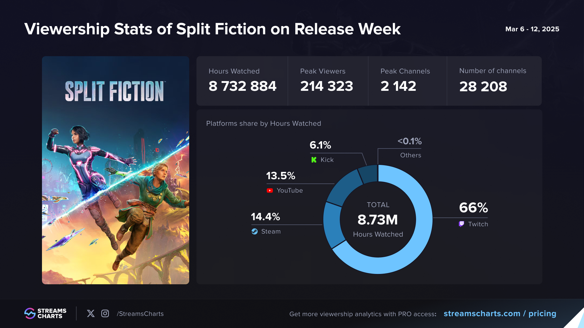 In the first week after its release, Split Fiction streams accumulated over 8,700,000 Hours Watched across all streaming platforms. Nearly 66% of that total came from Twitch broadcasts. Steam and YouTube also ranked among the top three platforms for viewership — a significant part of Steam's activity is tied to the 24/7 marathon on the official EA channel.