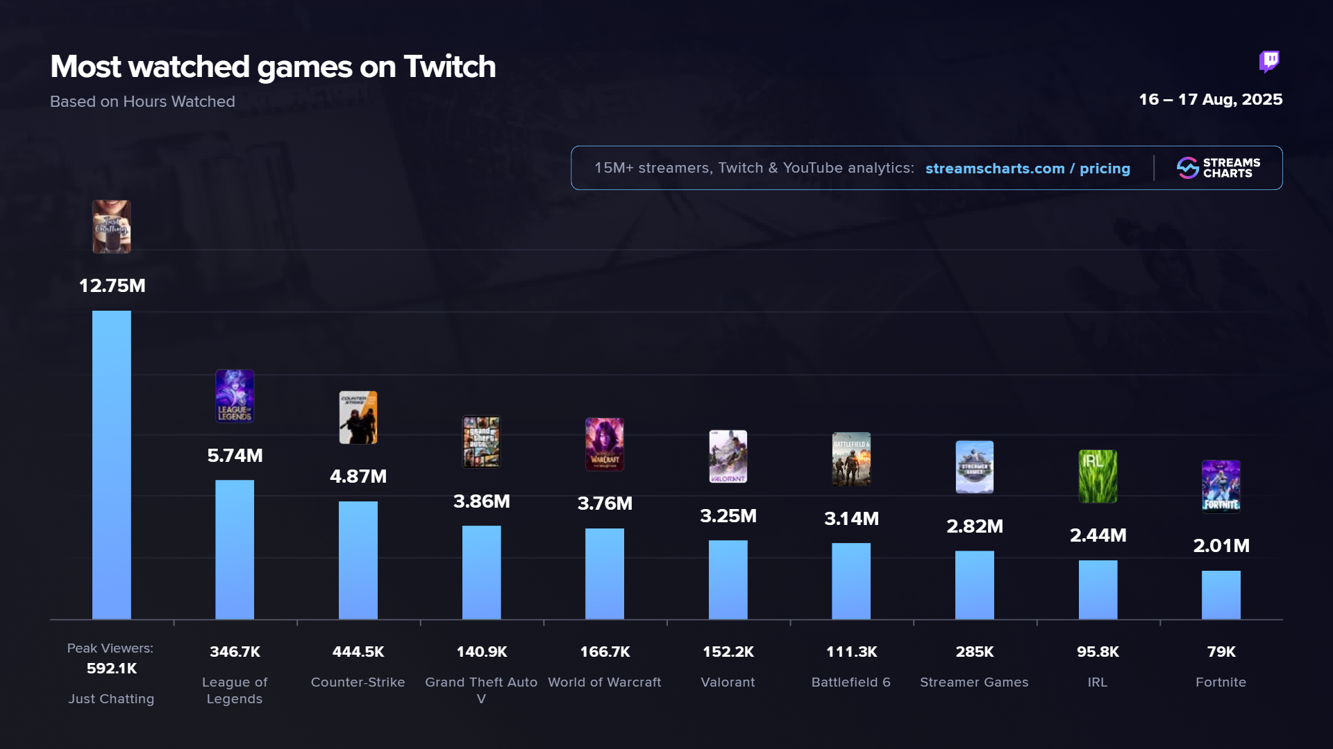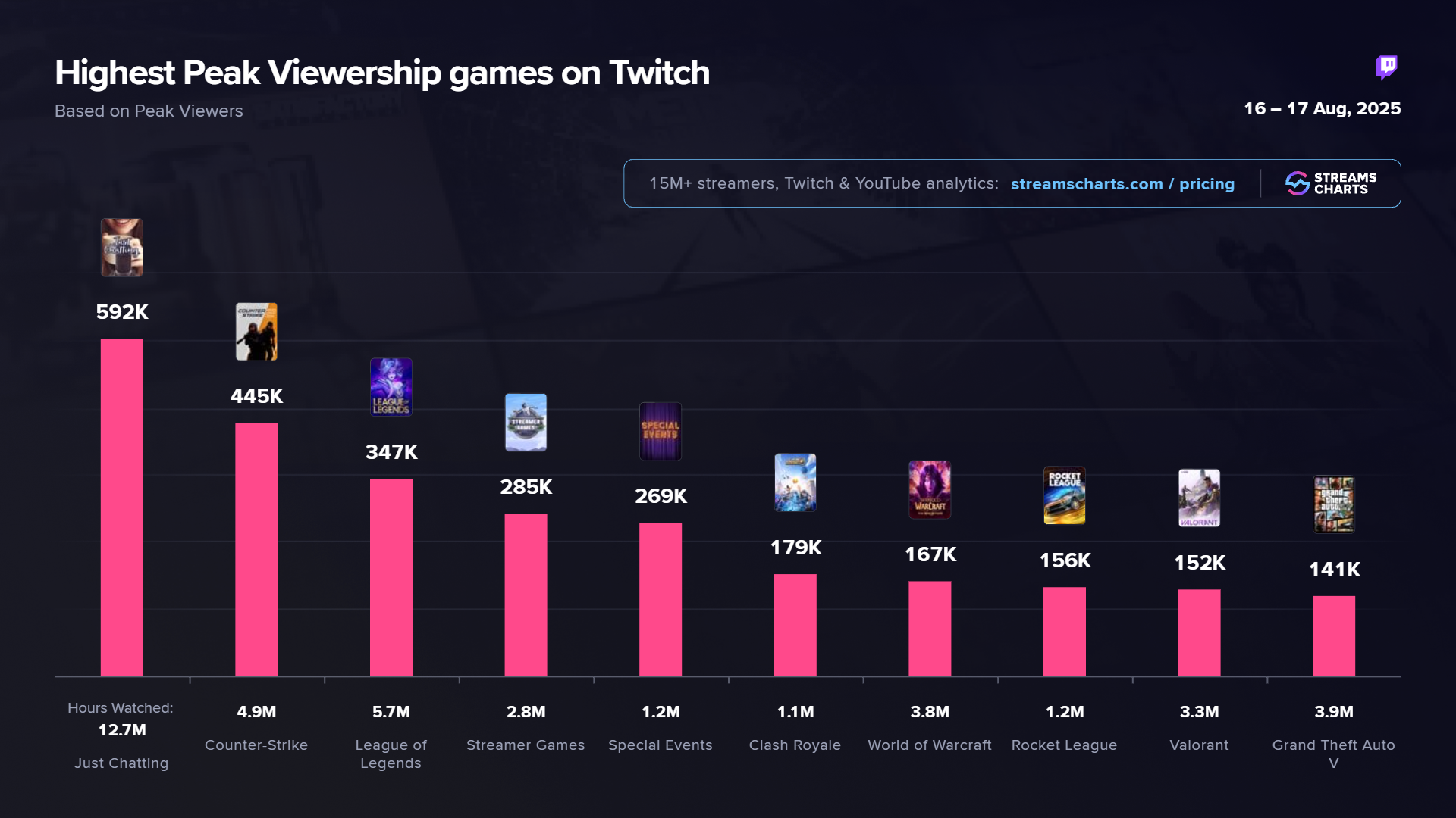 From August 16–17, the Streamer Games section on Twitch amassed 2.8 million Hours Watched, placing eighth among all categories on the platform during that span. The event averaged 97,100 viewers and peaked at 285,000 concurrent viewers, ranking fourth on Twitch by both metrics for the weekend. And that’s just on Twitch: the overall numbers climb even higher when YouTube viewership is included.