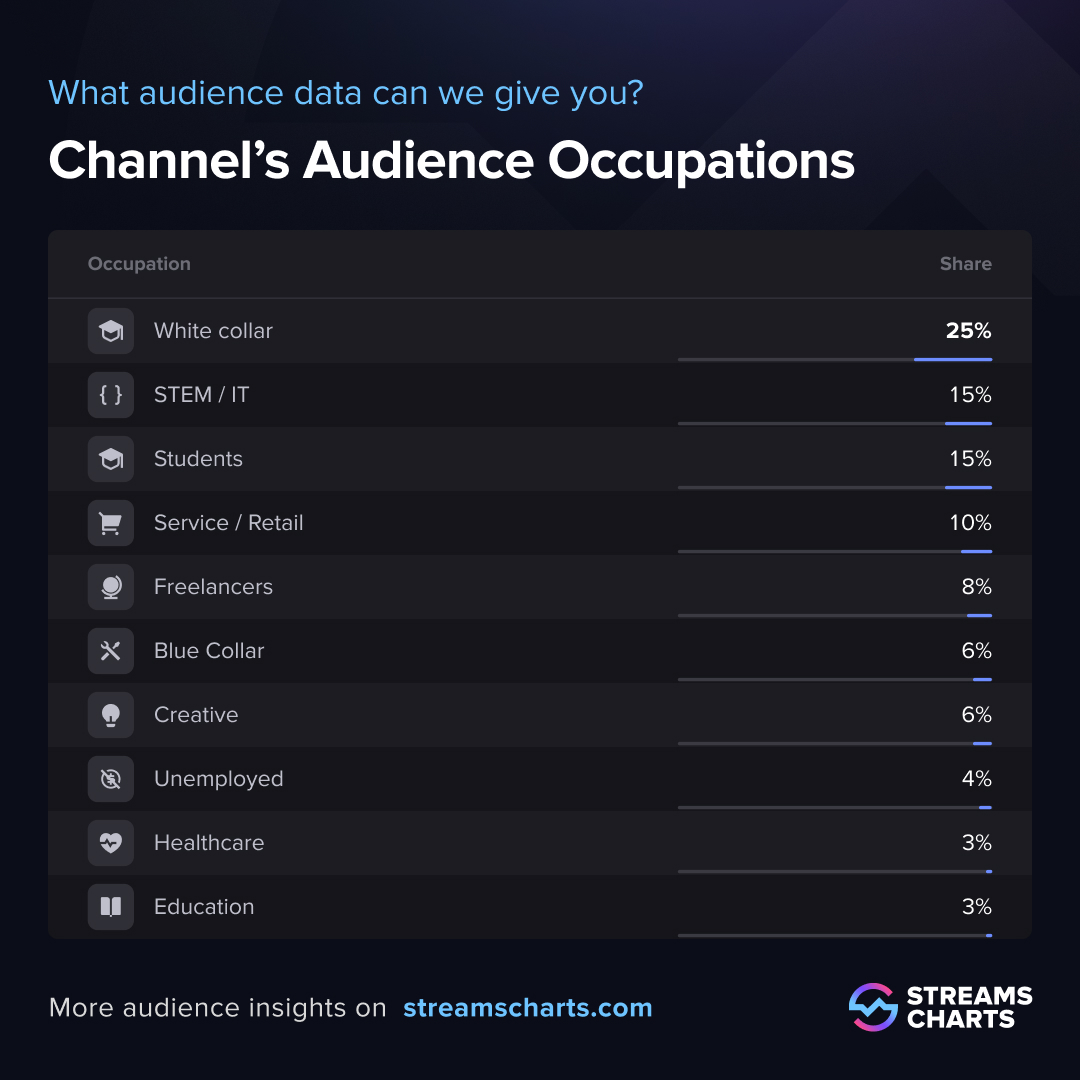 At the same time, students represent 15% of his viewers, providing a steady influx of younger followers who refresh the community’s energy and help maintain cultural relevance. Service and retail workers (10%), freelancers (8%), and blue-collar professionals (6%) round out a segment that watches Twitch as a daily entertainment habit, a group ideal for mass-market products, gaming peripherals and accessible consumer brands.