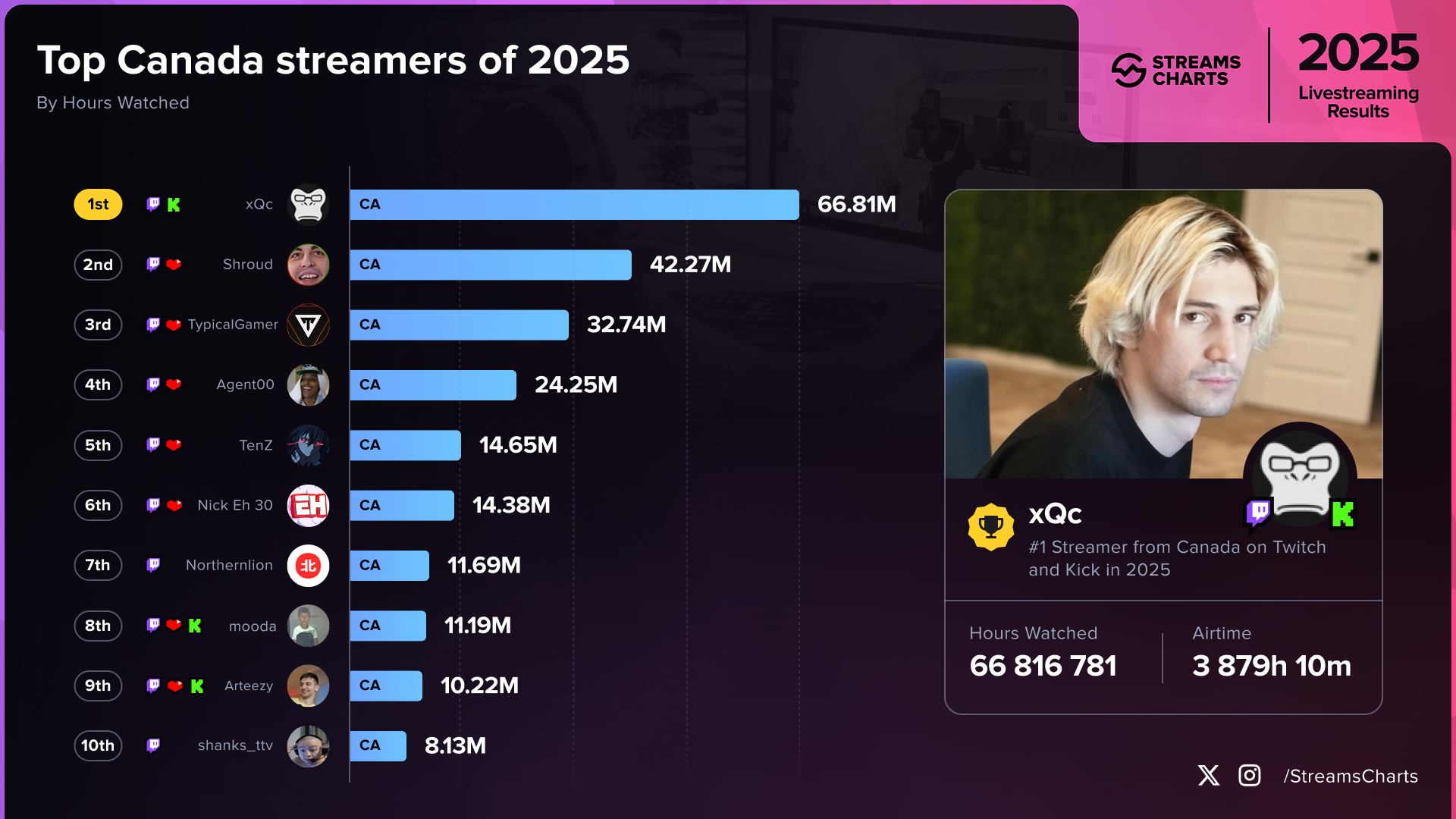 As you may have noticed, the overall most-watched U.S. and Canadian streamers ranking included only one Canadian — xQc. Since we felt this list was a bit one-sided, we put together a separate top 10 specifically highlighting Canadian streamers.