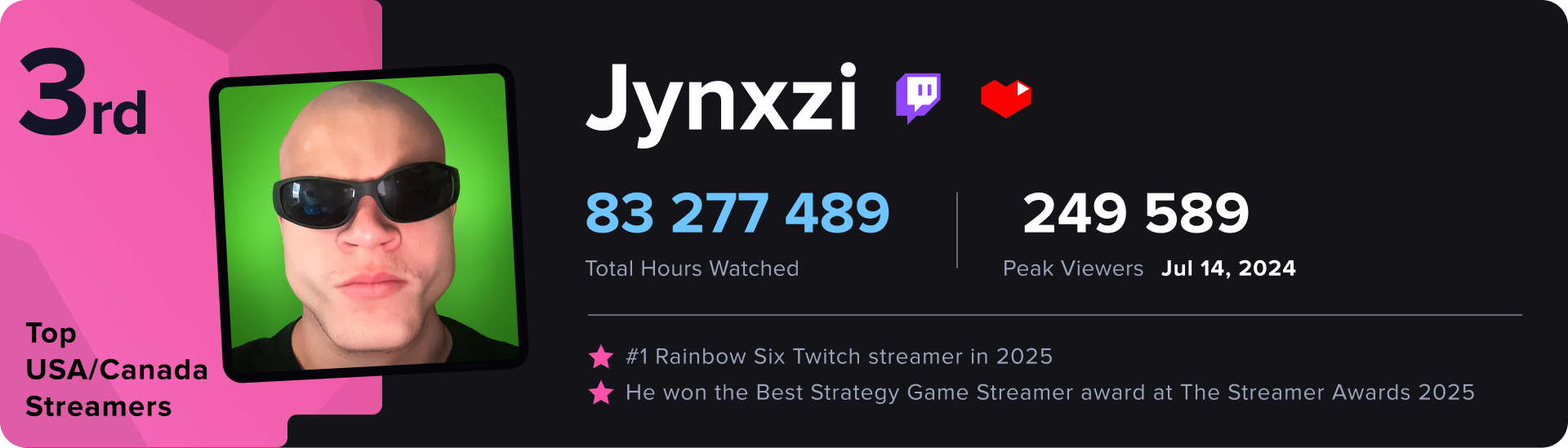 In 2025, Jynxzi was highly active streaming Rainbow Six Siege and Clash Royale, becoming the most-watched streamer on Twitch in both categories. He extensively covered the release of Rainbow Six Siege X and spent many hours streaming Fortnite, Geometry Dash, and EA Sports FC 25.