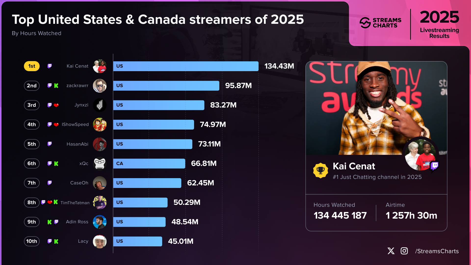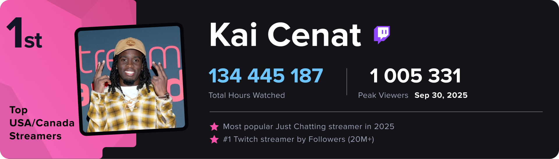 North America is home to some of the world’s top content creators. Streamers here don’t just pull massive audiences, they build full-on entertainment experiences with new shows and formats. From Kai Cenat’s Streamer University and Darren "IShowSpeed" Watkins Jr. travel adventures to Hasan "HasanAbi" Piker’s political commentary, plenty of North American content dominated livestreaming in 2025