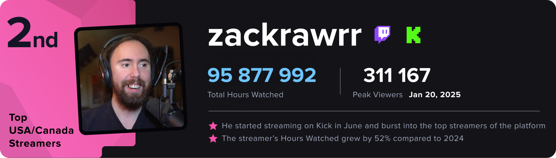 | 2 | zackrawrr | US | Twitch + Kick | 95 877 992 |