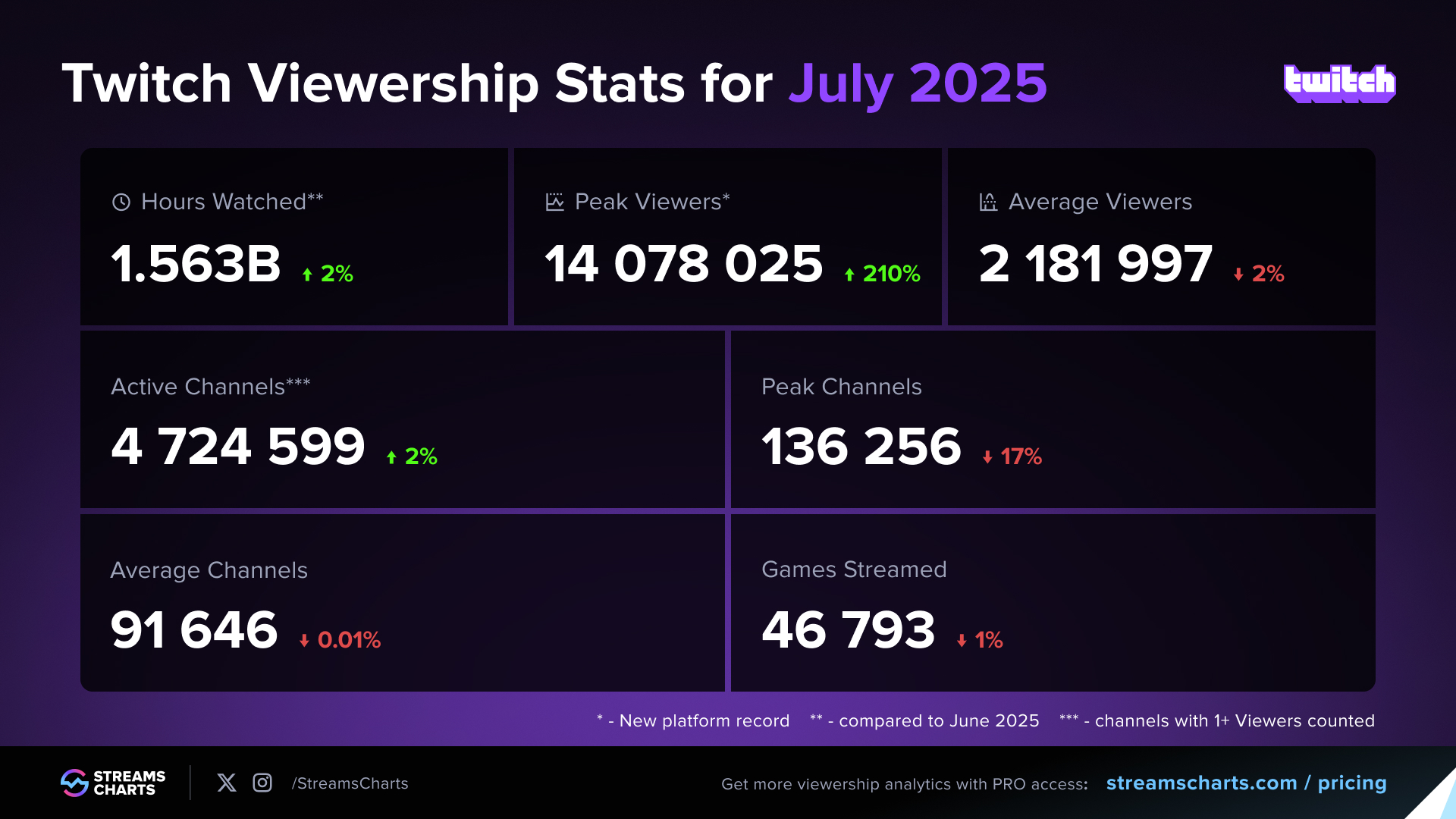 Another notable stat is the 17% drop in peak channel count compared to the previous month. But this isn’t out of the ordinary — the metric simply returned to its typical level after a sharp 17% spike in June. That temporary boost was fueled by a major in-game Fortnite event celebrating the launch of a new season, which significantly increased streamer activity at the time.